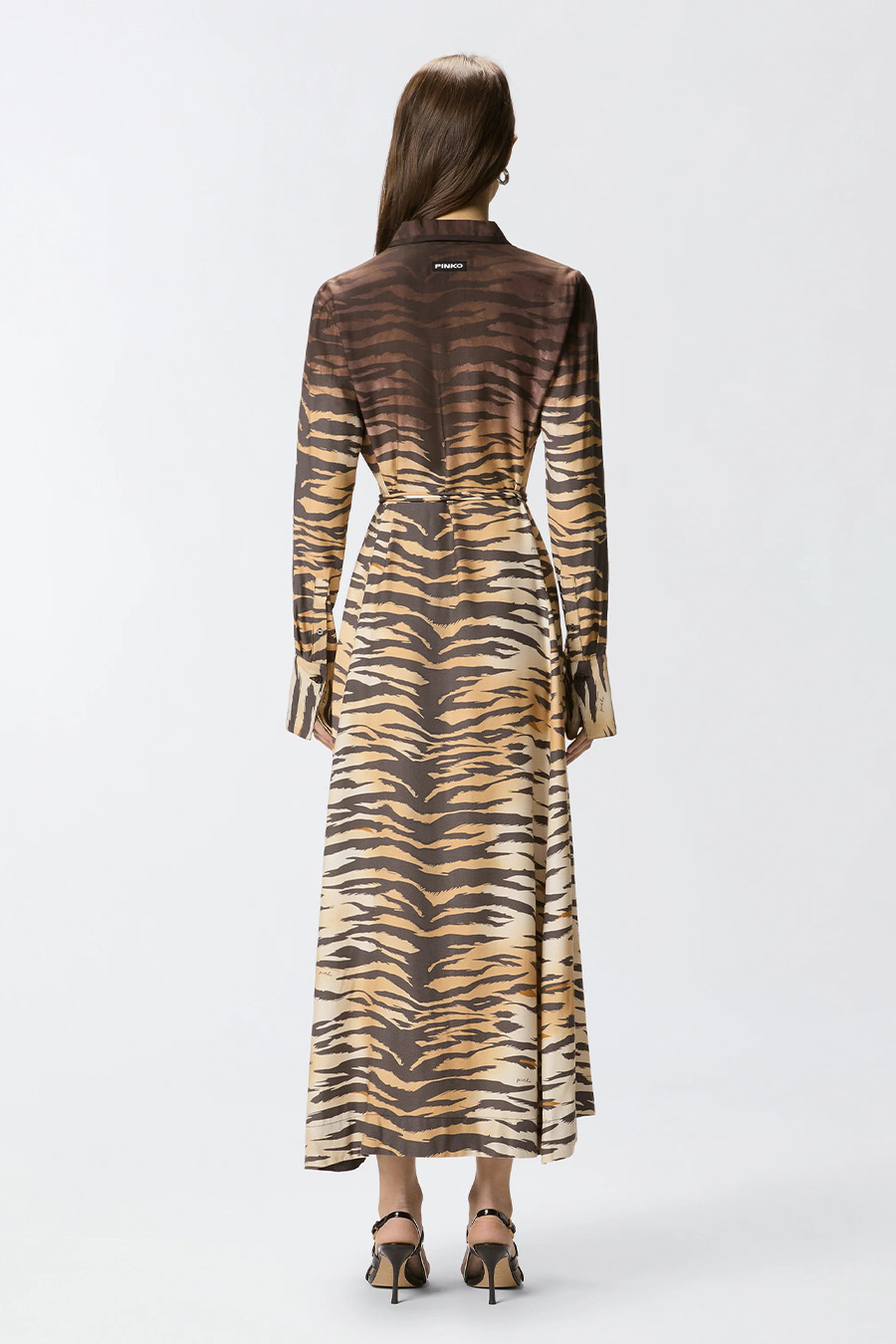 Made from flowing, shiny twill fabric with a tiger animal print and a darker upper section with a shaded effect.