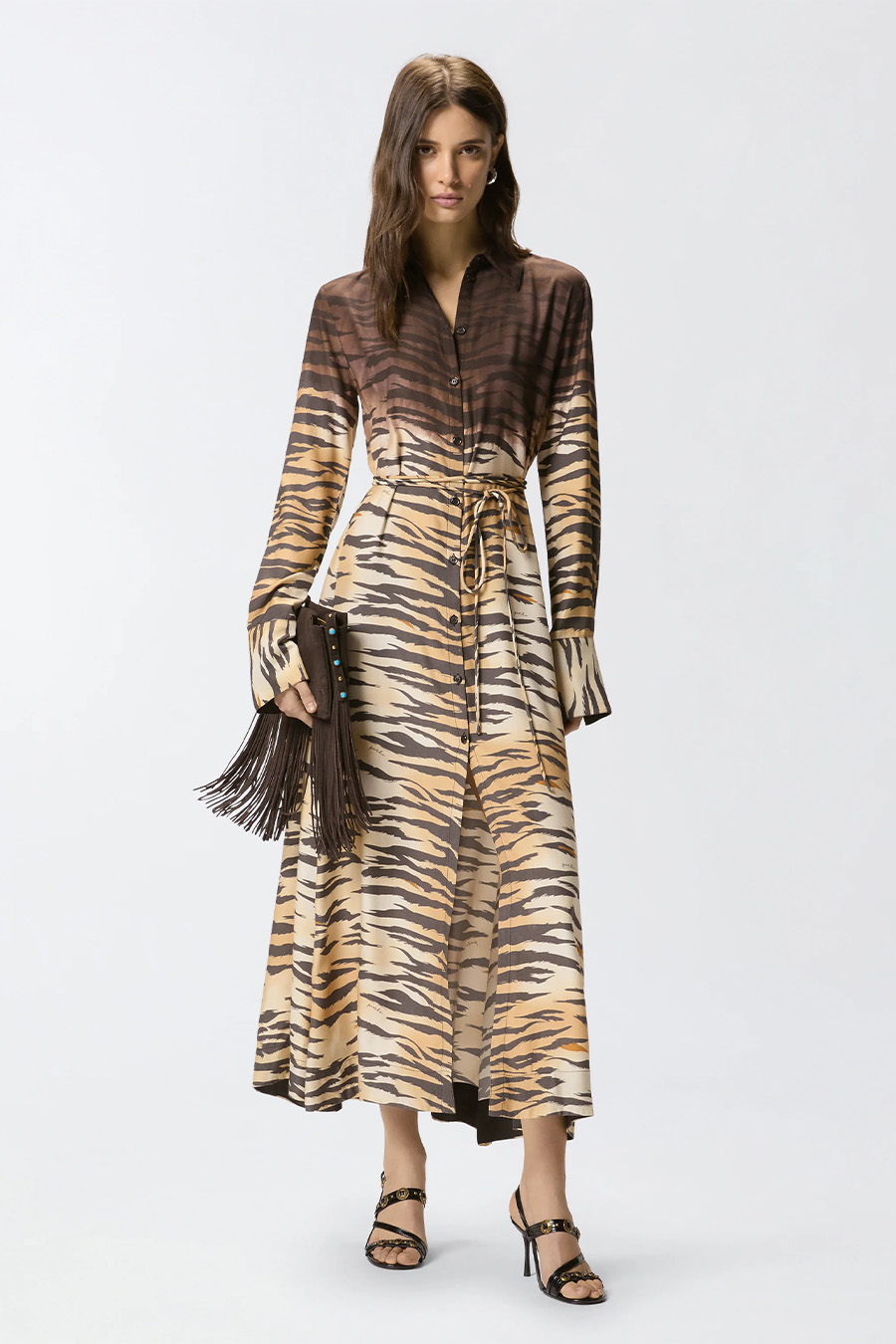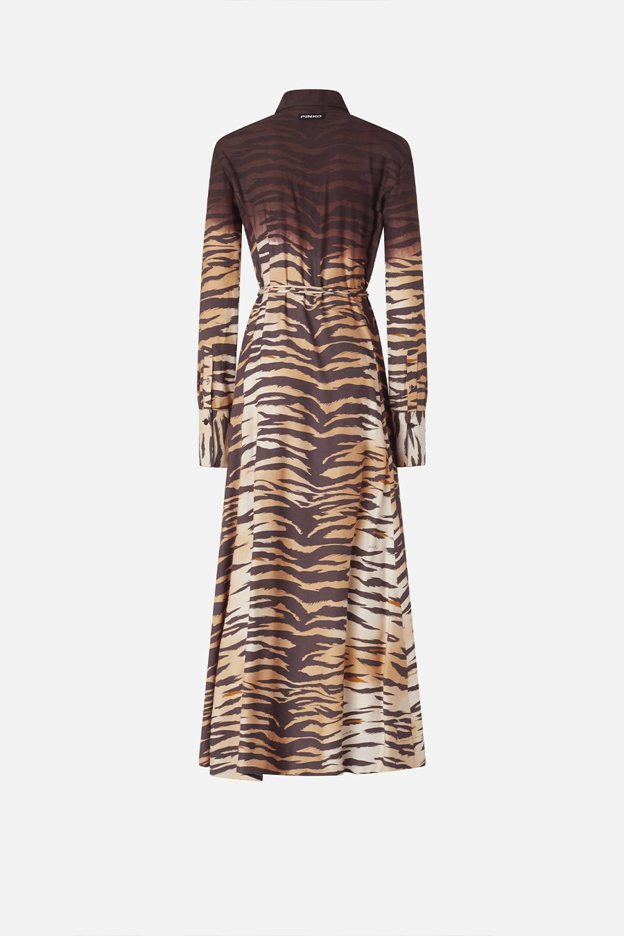 Long shirt dress with animal print by Pinko with slightly flared skirt, front button fastening, shirt collar, sleeves with buttons at the cuffs and thin belt at the waist to tie as desired.
