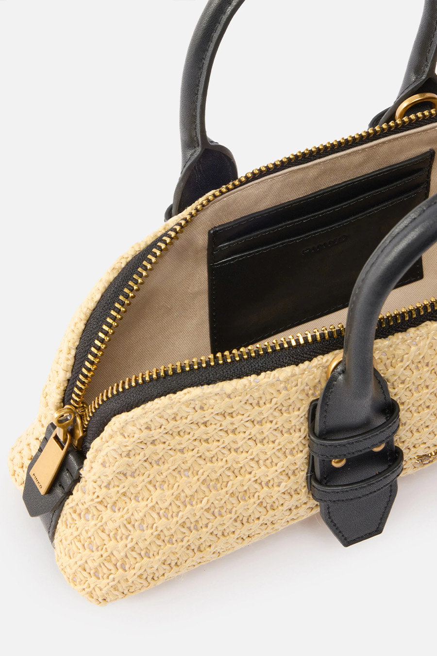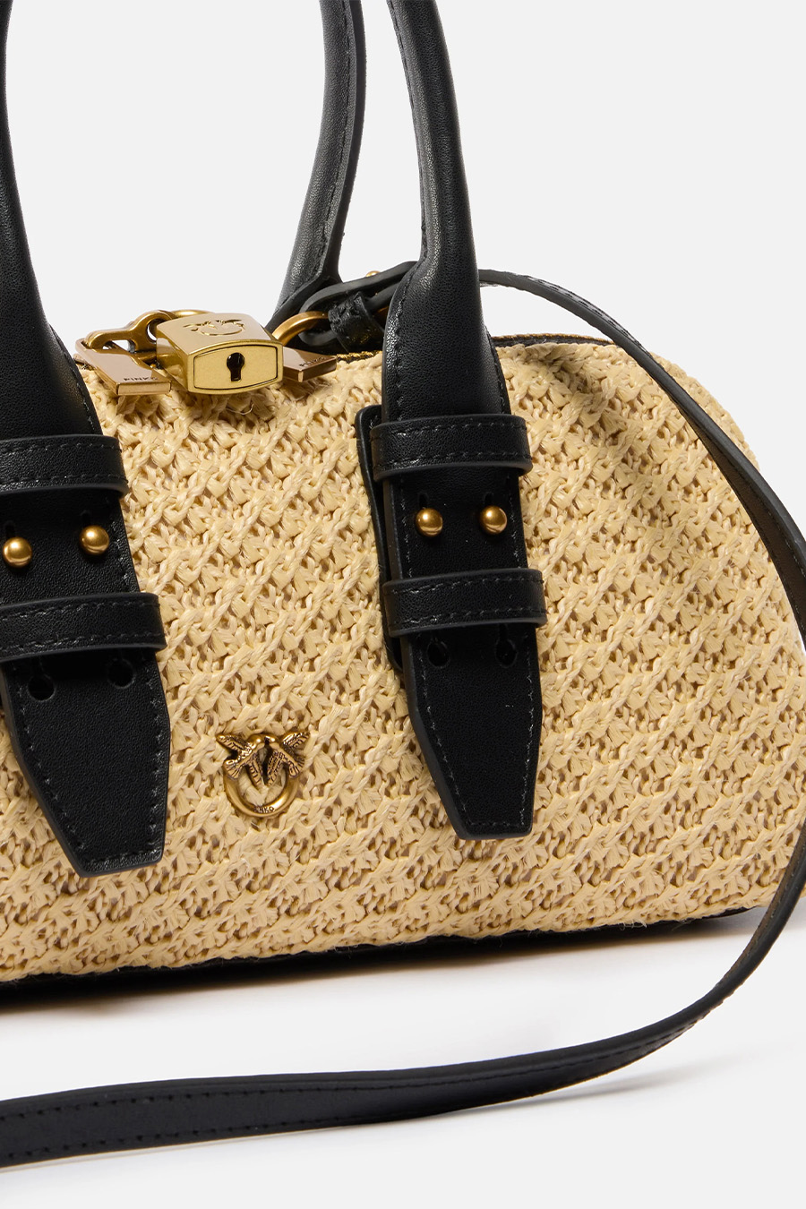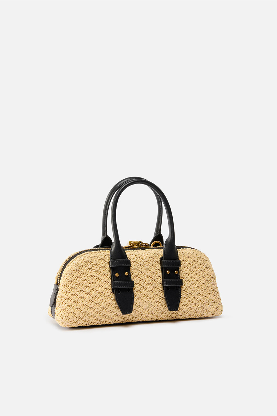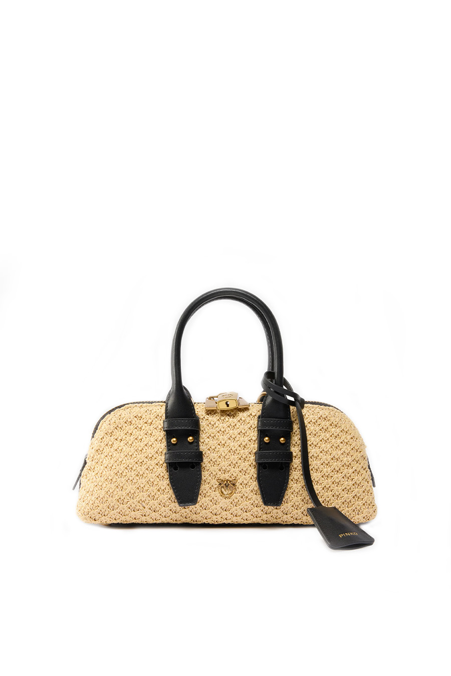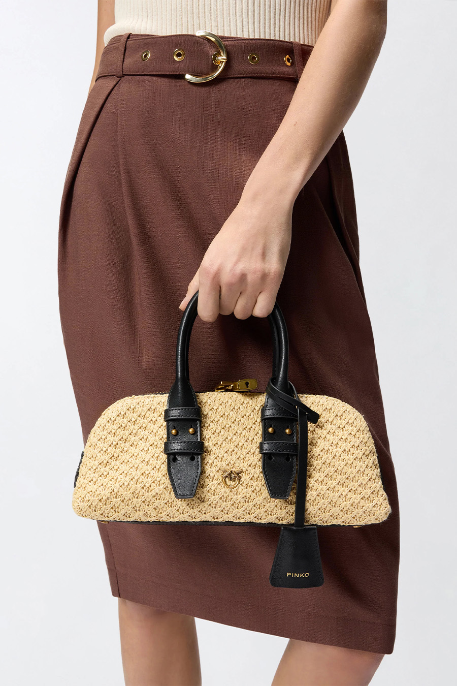 Small Escape Bag Horizontal bowling bag by Pinko, made of woven raffia, with two top handles for carrying by hand and an adjustable, removable leather shoulder strap for wearing over the shoulder or crossbody.