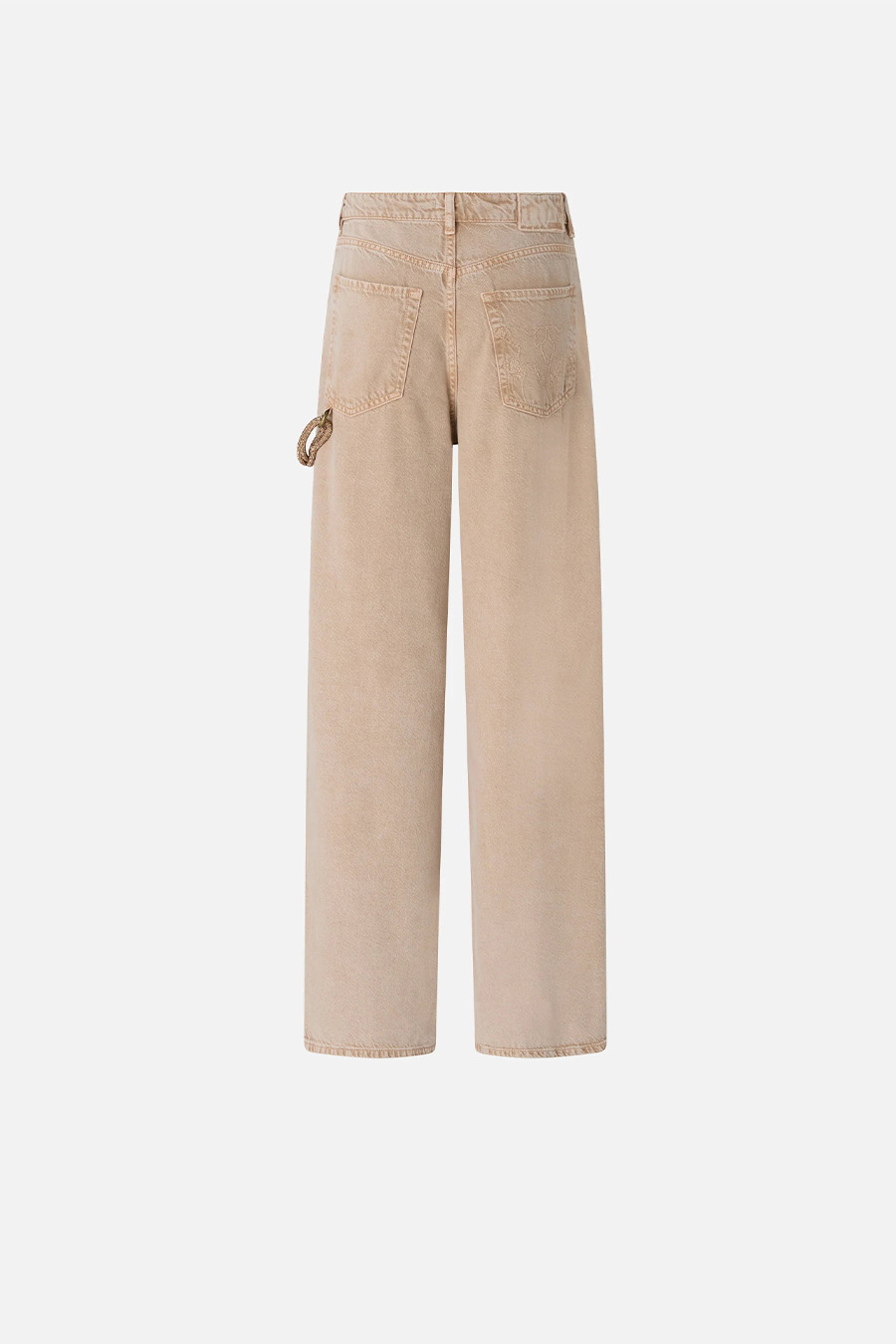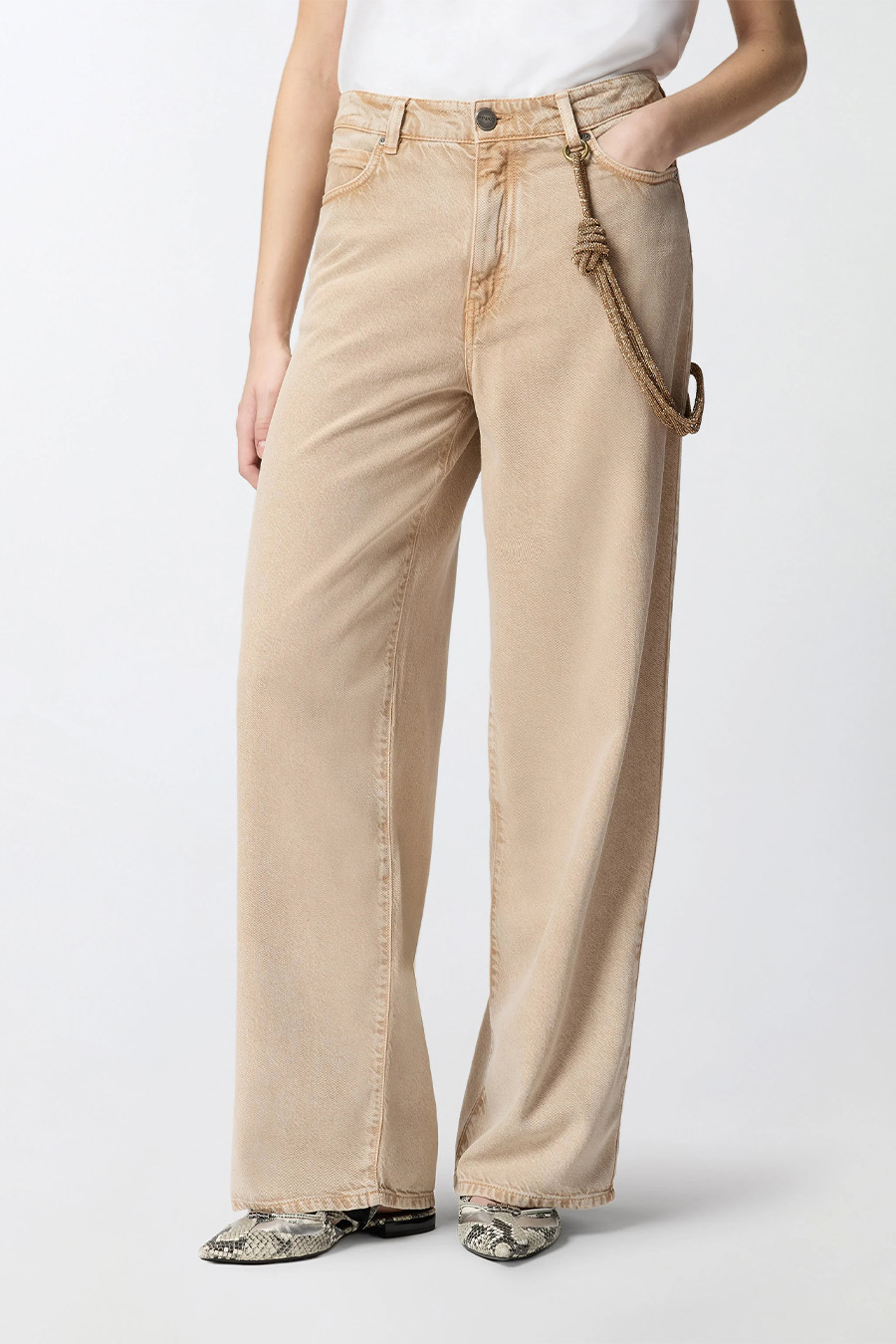 PINKO five-pocket jeans with a relaxed fit, made from cotton and lyocell bull denim with a marbled wash for a refined used effect, embellished with a bright removable jewelled cord that can be attached to the front loop and a small loop on one of the back pockets, with a tone-on-tone Love Birds logo embroidered on one of the back pockets.