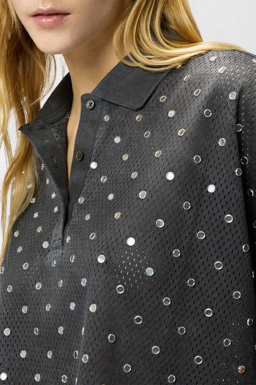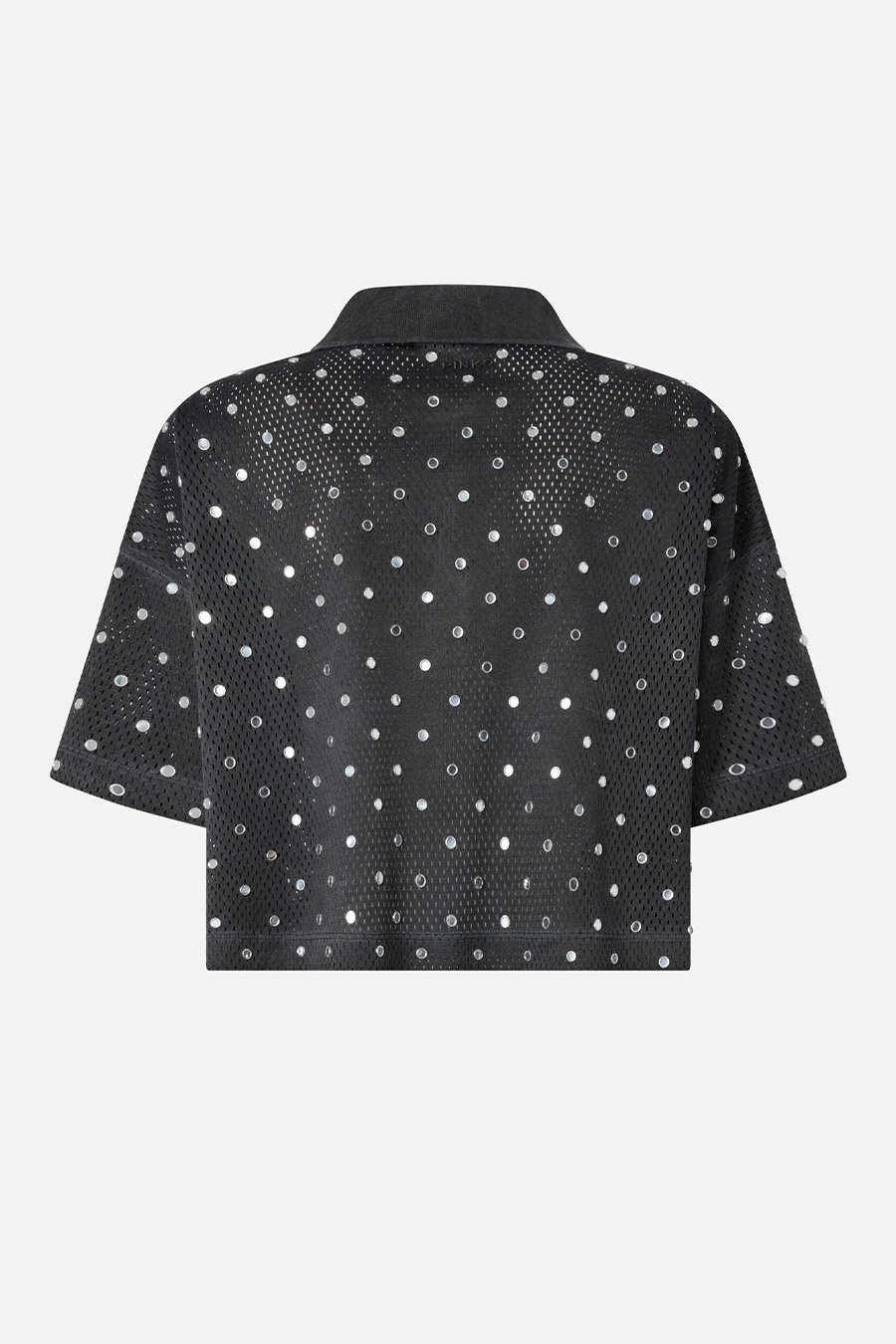 Cropped mesh polo shirt with mirrors Pinko made from jersey with a slightly faded finish, featuring a basketball-inspired mesh design and embellished with a shower of circular mirrors all over.