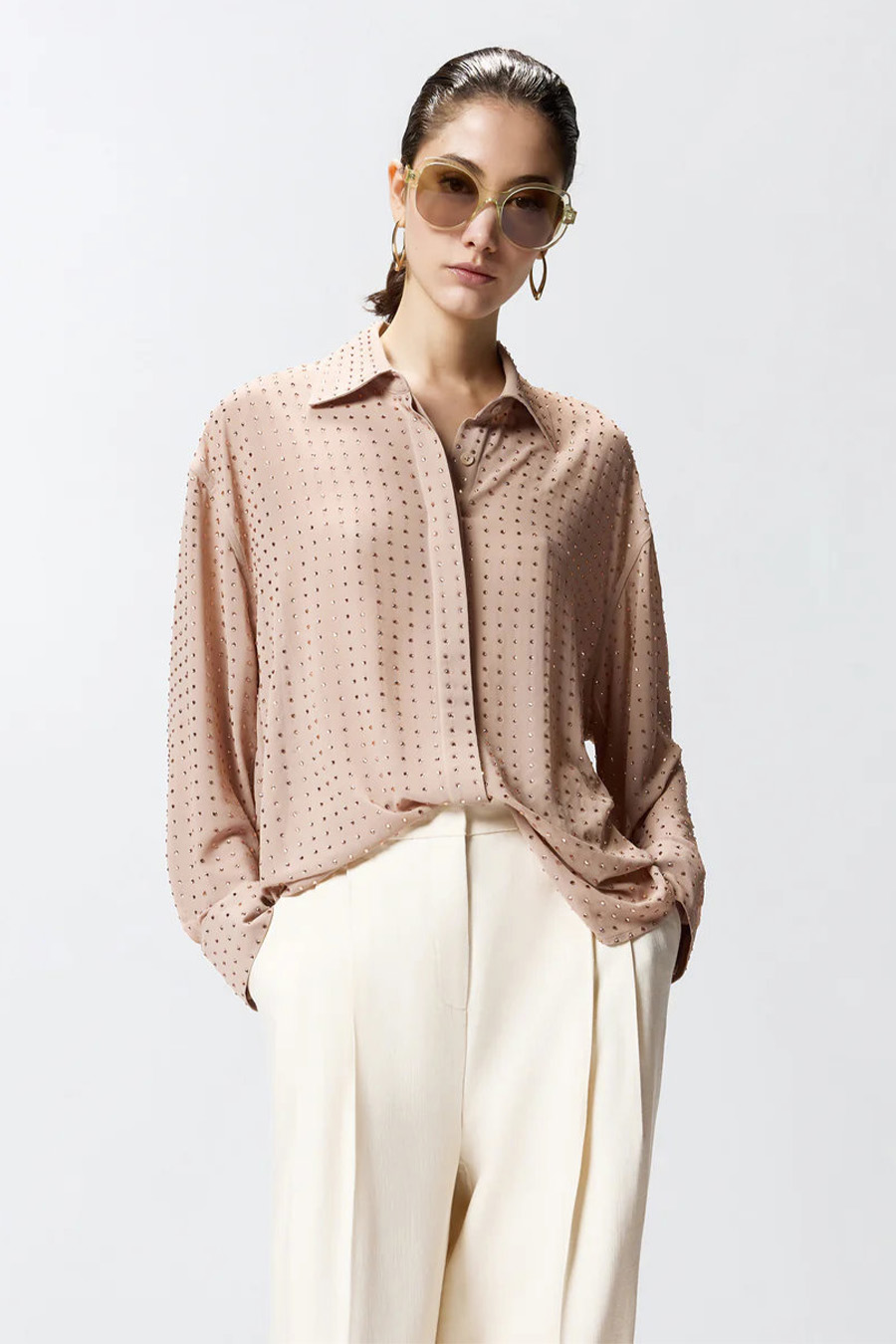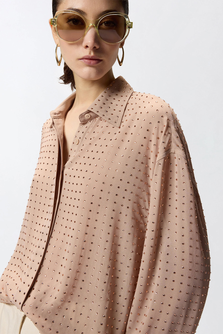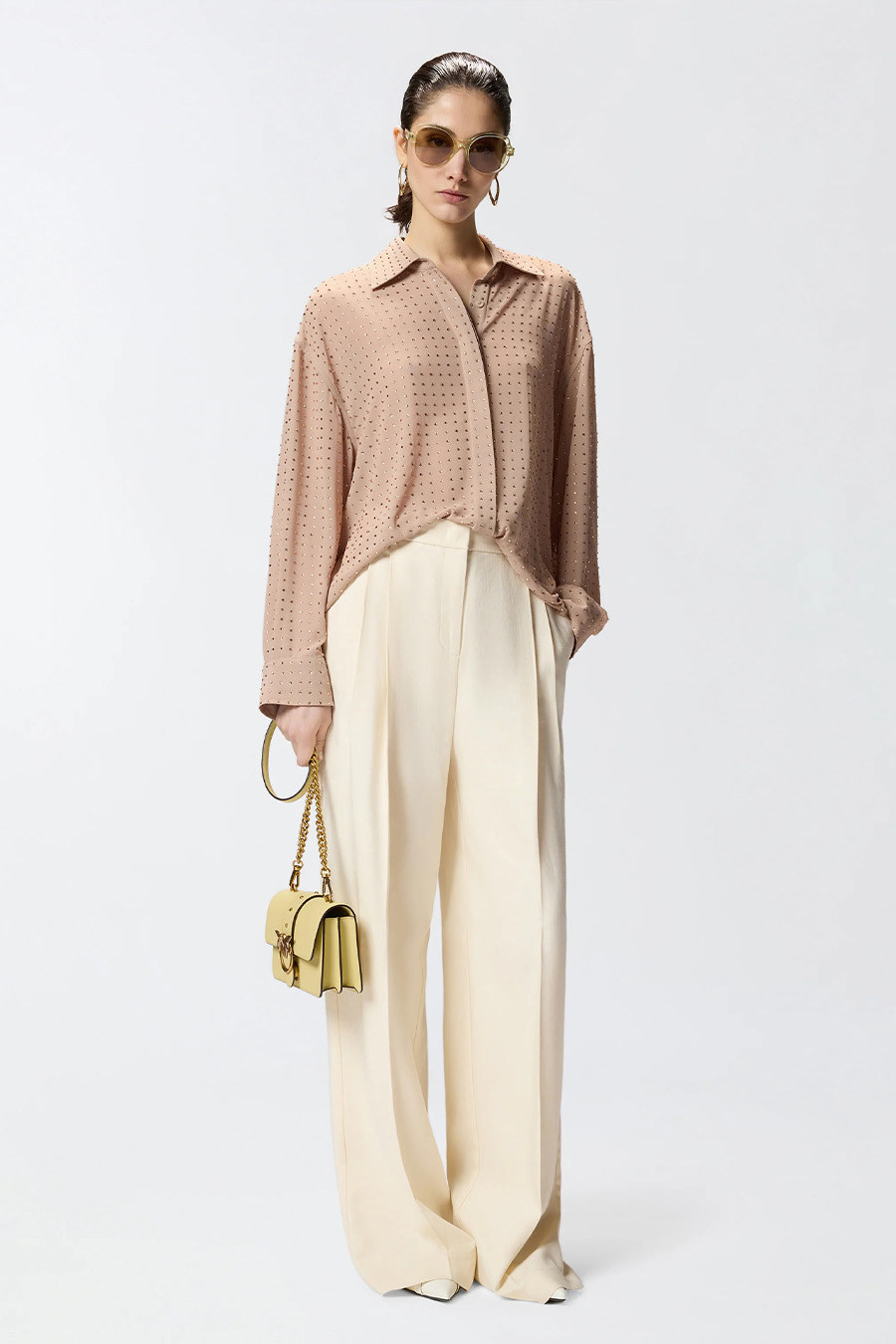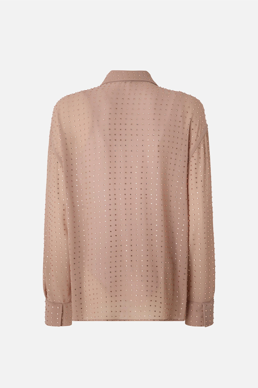 Pinko shirt with a straight cut and slightly more voluminous upper part, featuring a classic collar and long sleeves with dropped shoulders and cuffs, made from a georgette fabric with a refined matte finish and embellished with sparkling rhinestones across the entire surface of the garment.