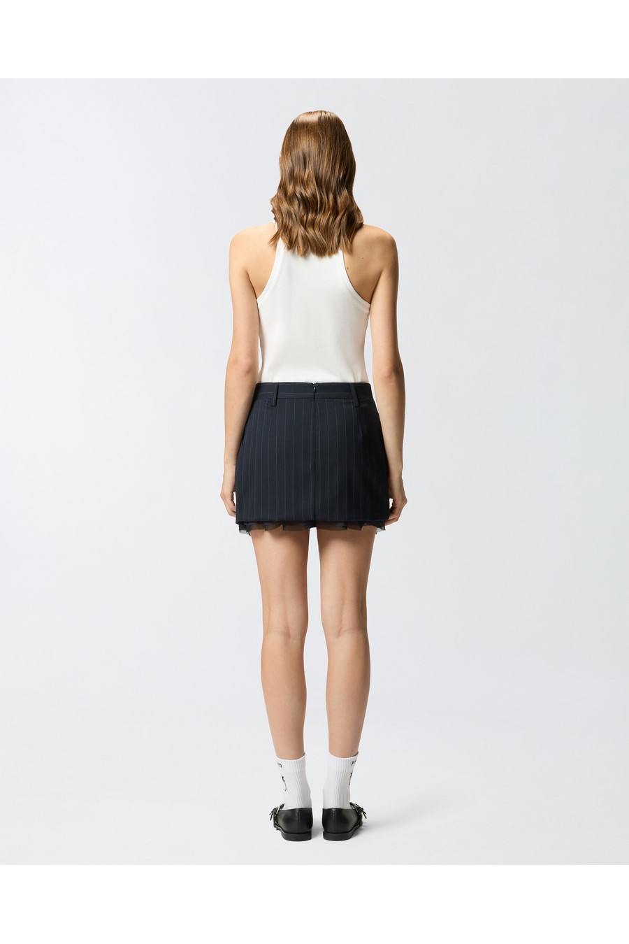 The poly wool pinstripe fabric has comfortable belt loops at the waist, while the hem is raw-cut for a lighter, more airy effect. Invisible zip fastening at the back.