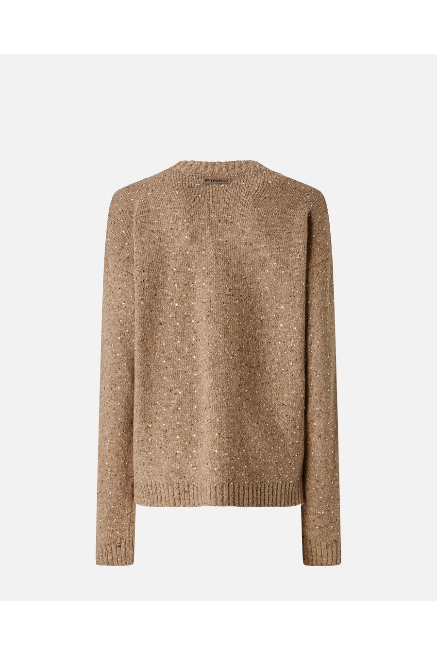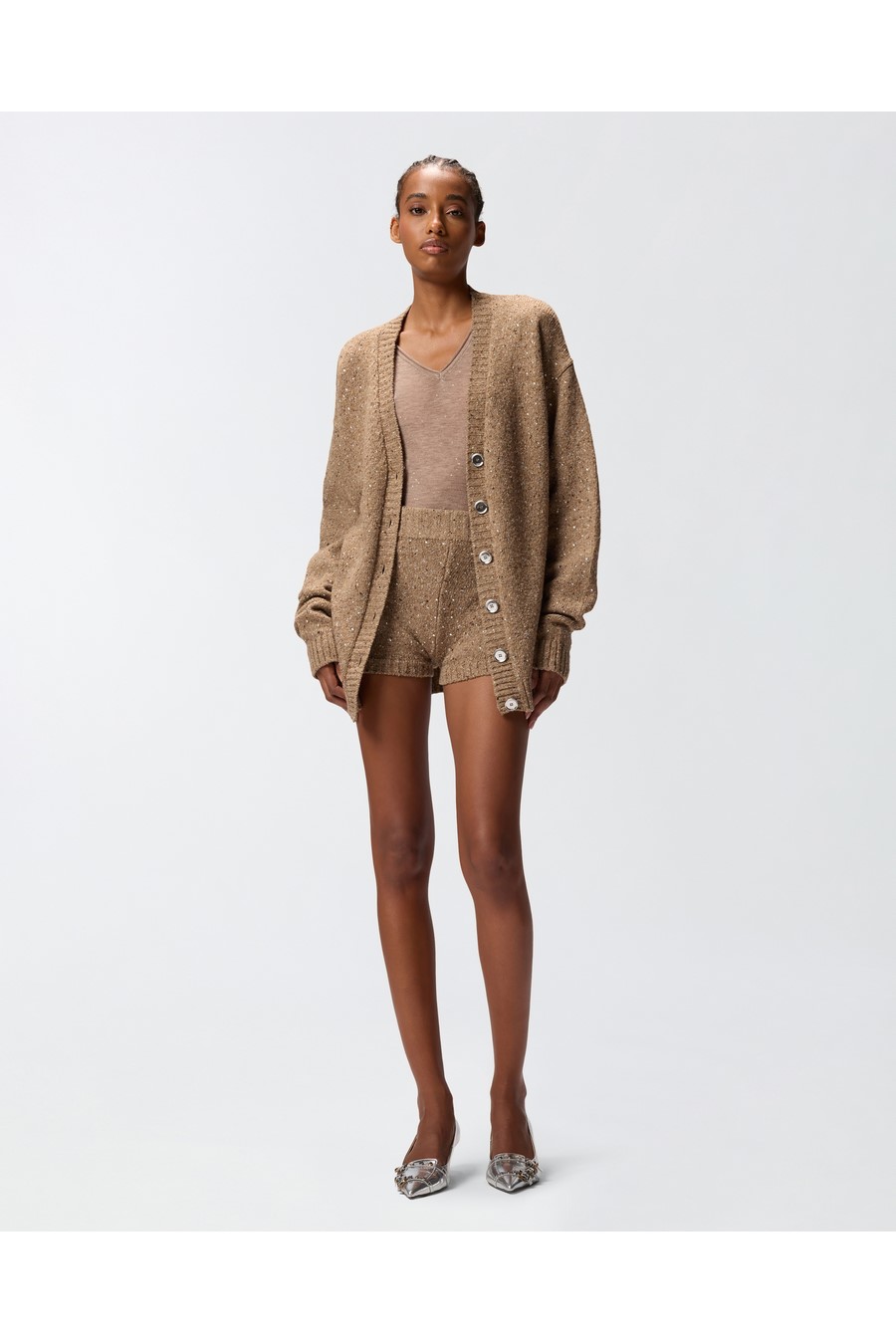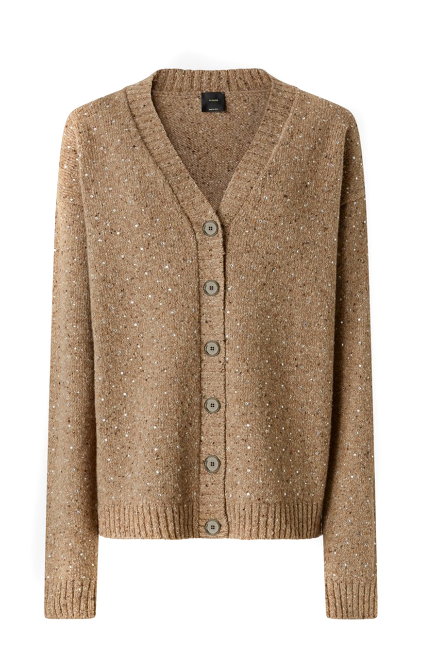 Pinko long-sleeved cardigan with rhinestones and a comfortable silhouette. The soft bouclé fabric is studded with rhinestones.