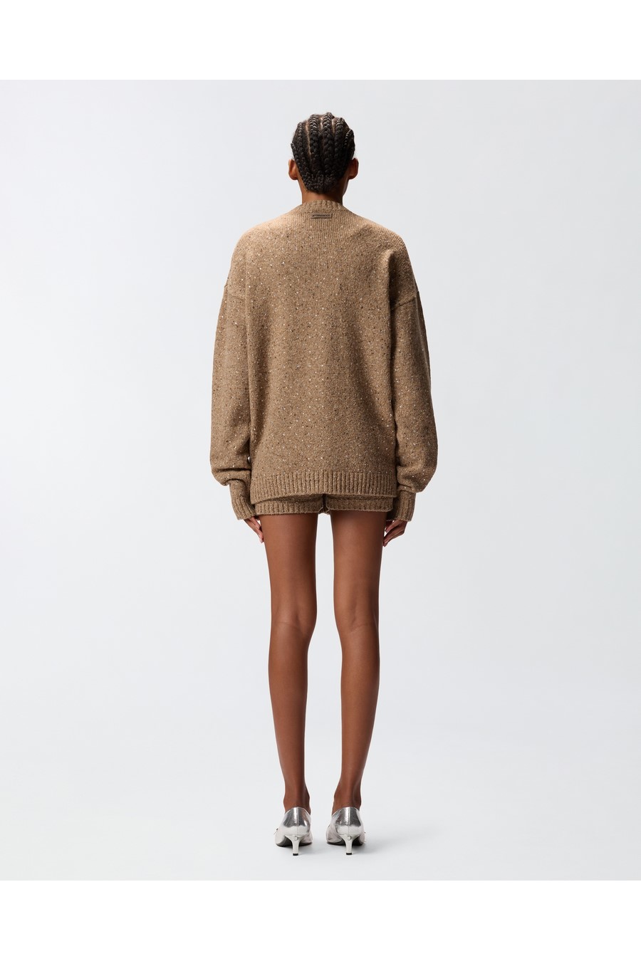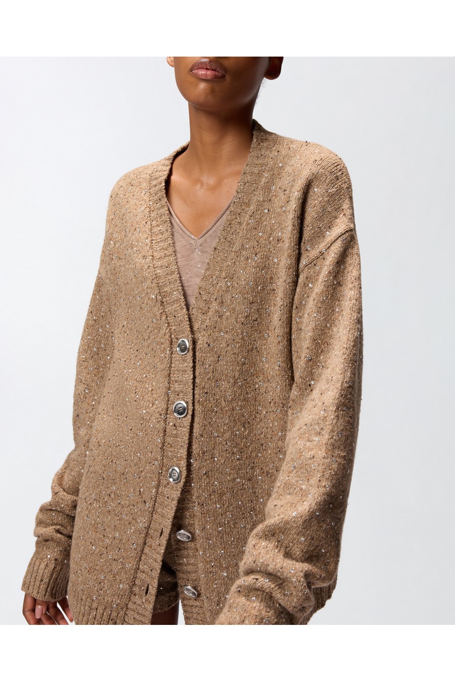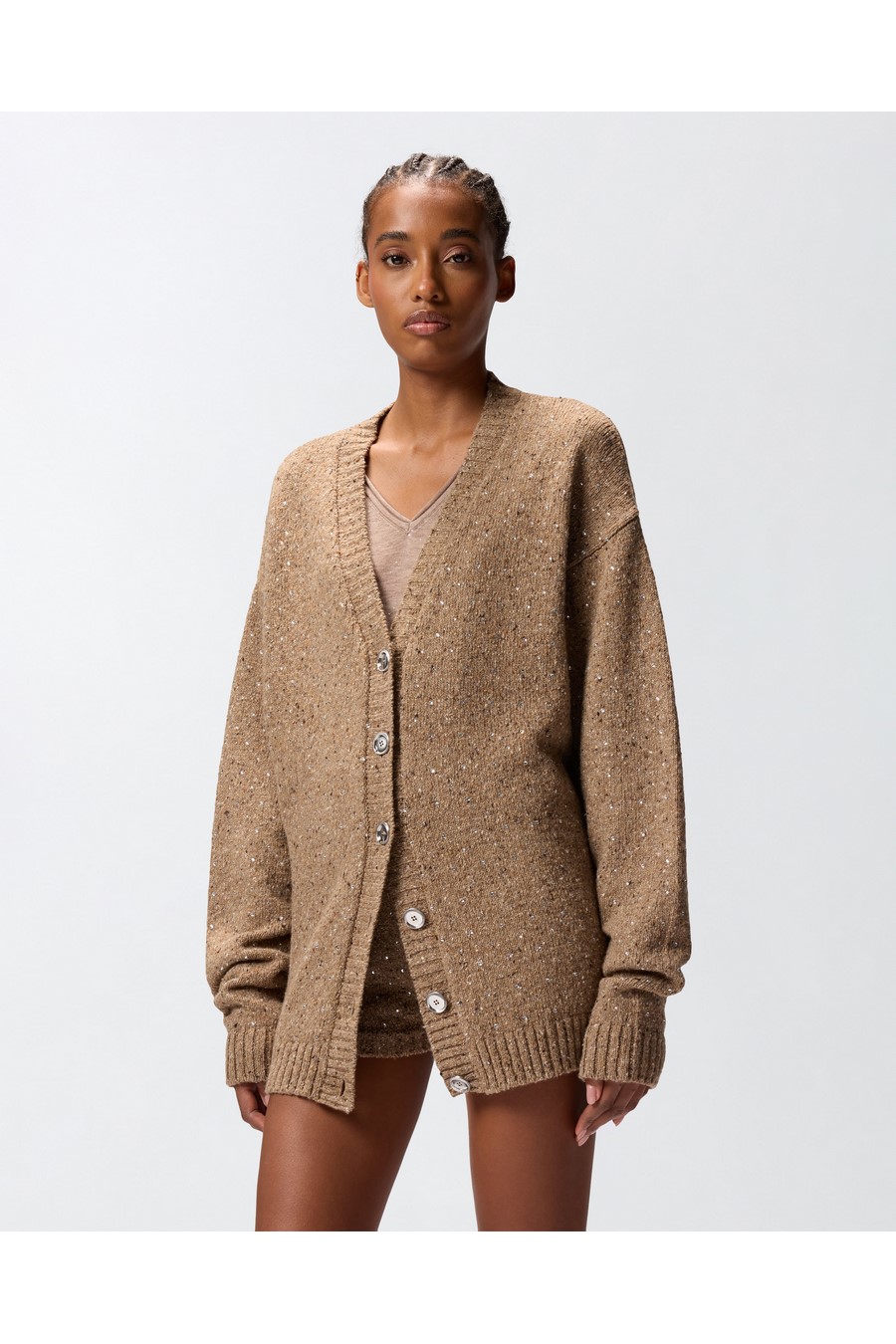 Pinko long-sleeved cardigan with rhinestones and a comfortable silhouette. The soft bouclé fabric is studded with rhinestones.