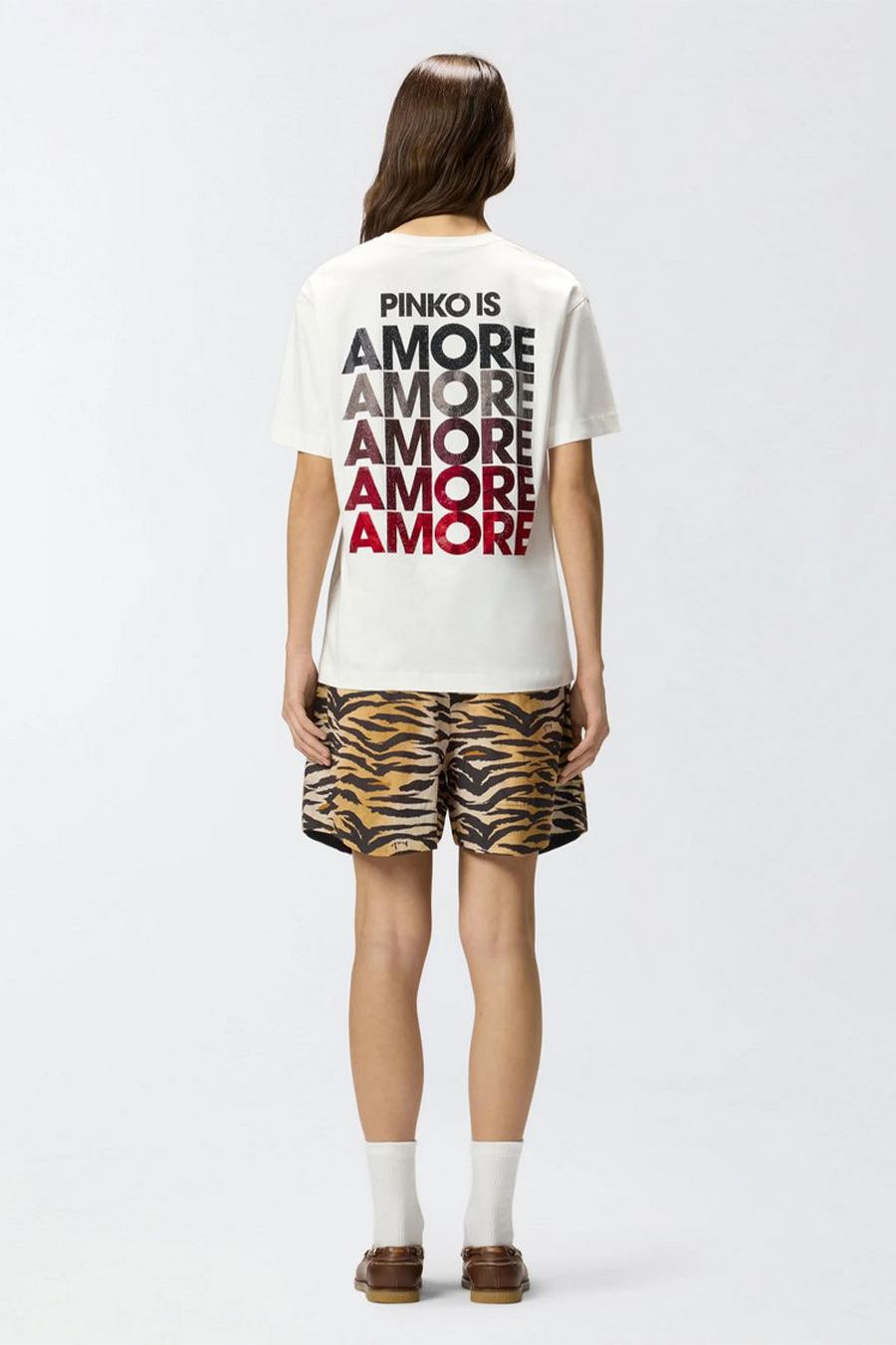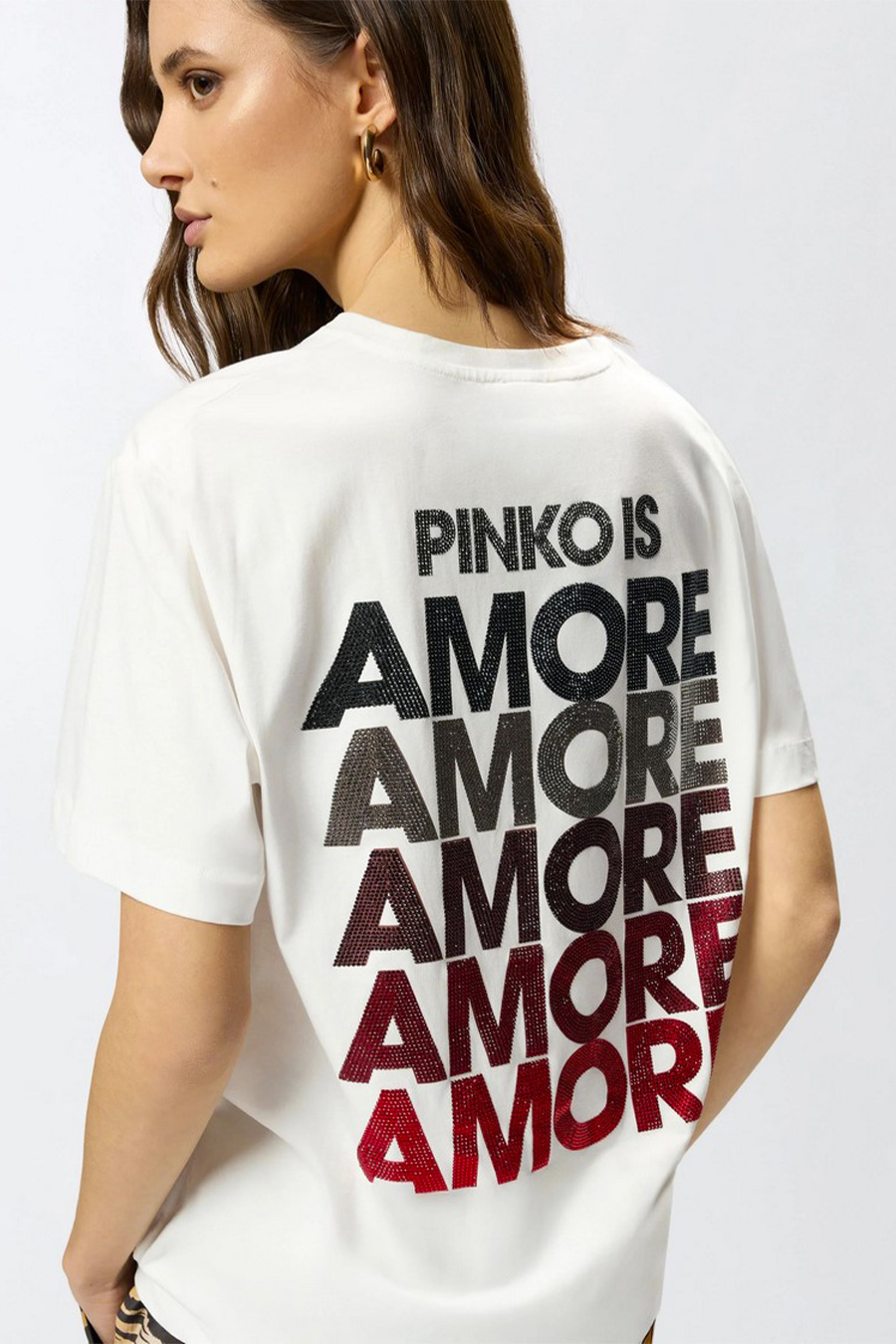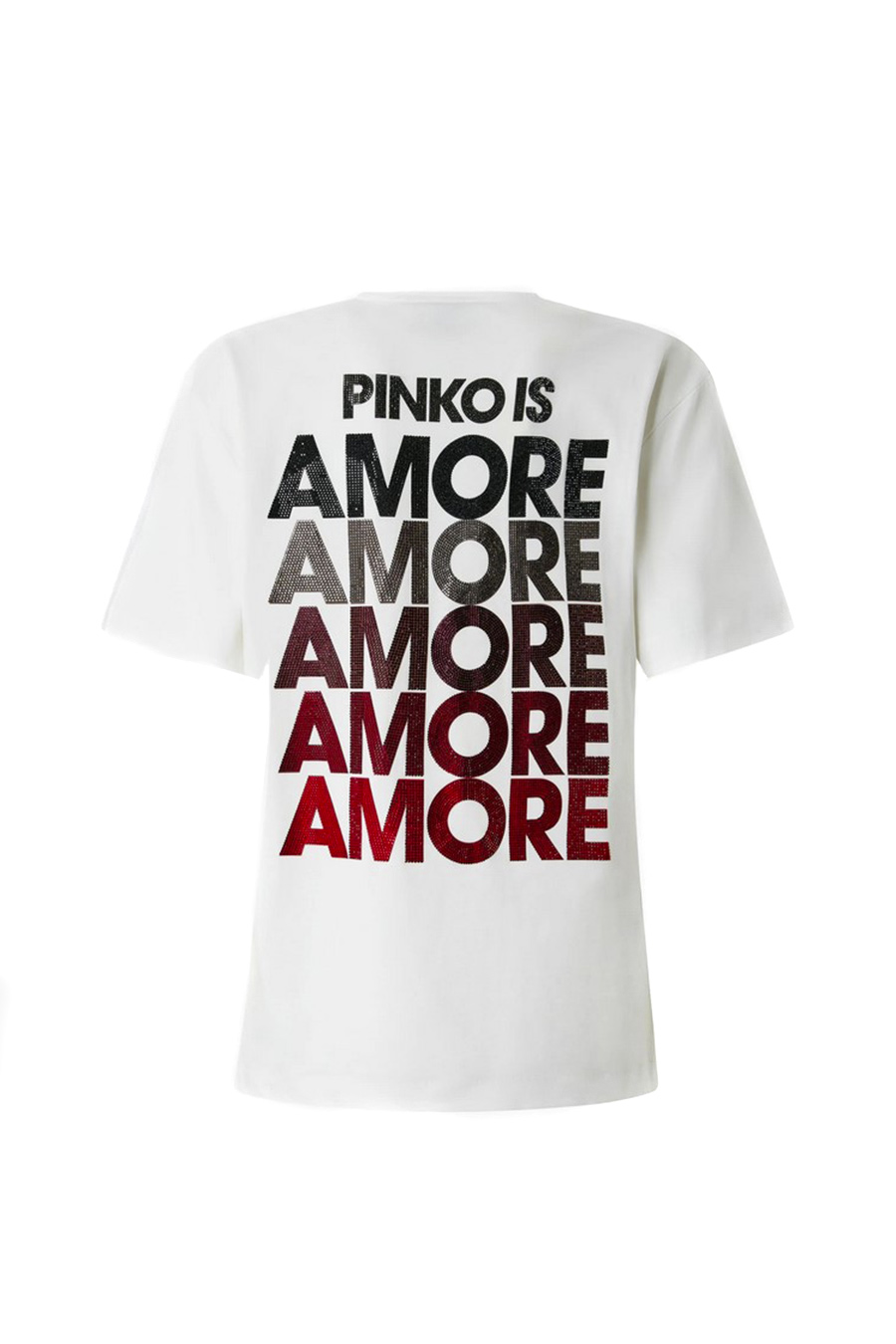 Pinko short-sleeved crew neck T-shirt in soft cotton jersey, featuring large multicoloured dégradé PINKO IS AMORE lettering in rhinestones on the back and the PINKO logo lettering forming a small heart in rhinestones on the chest.