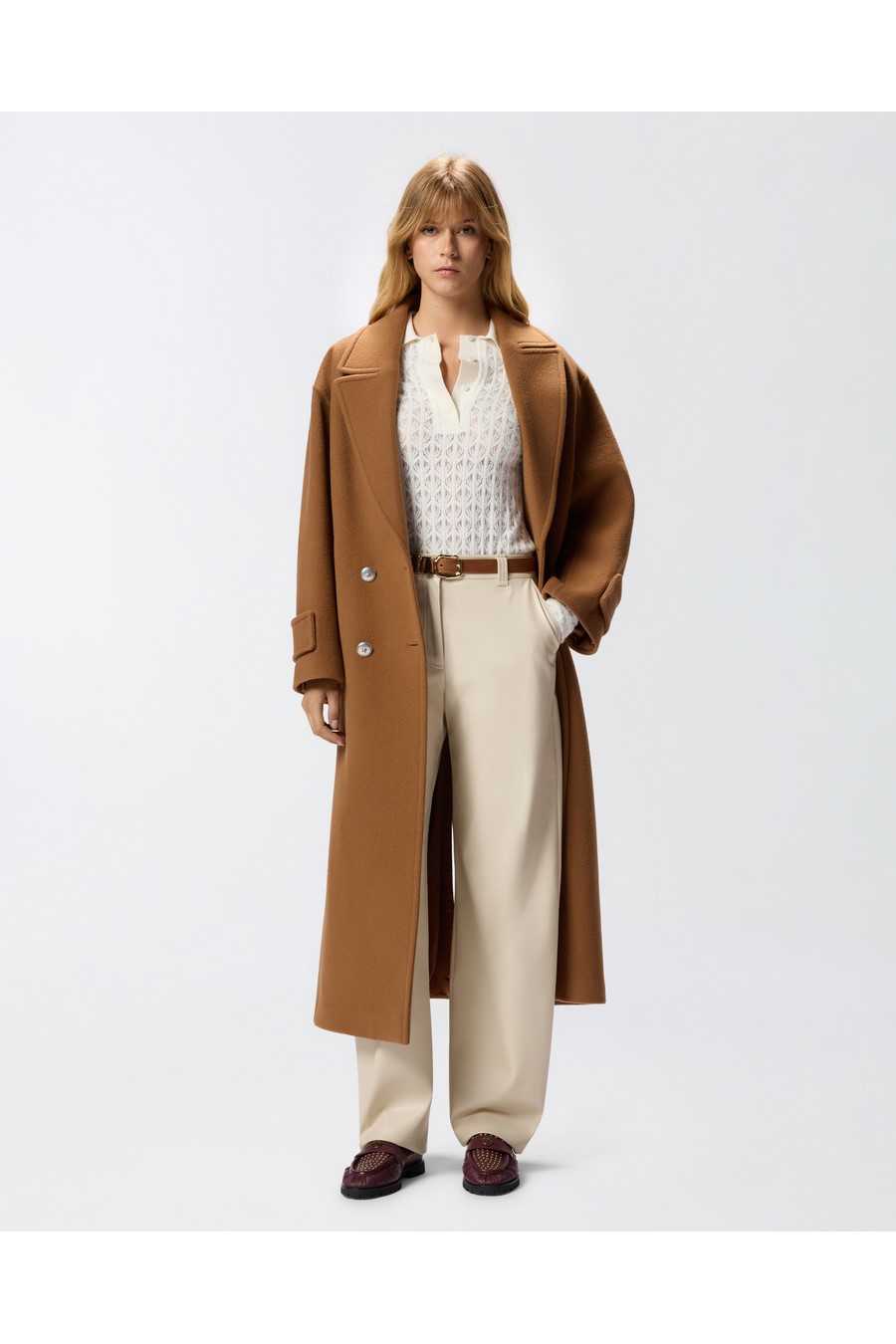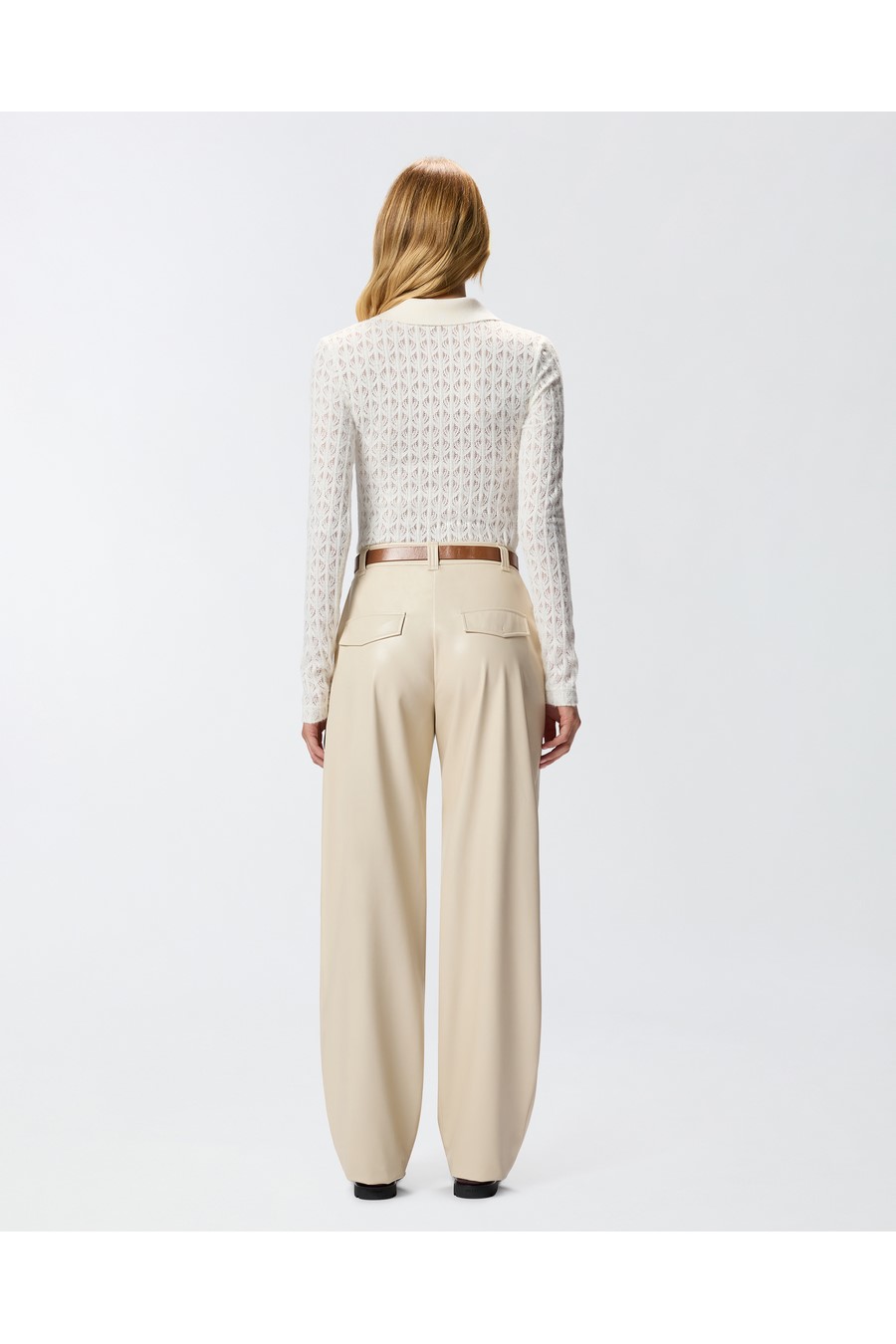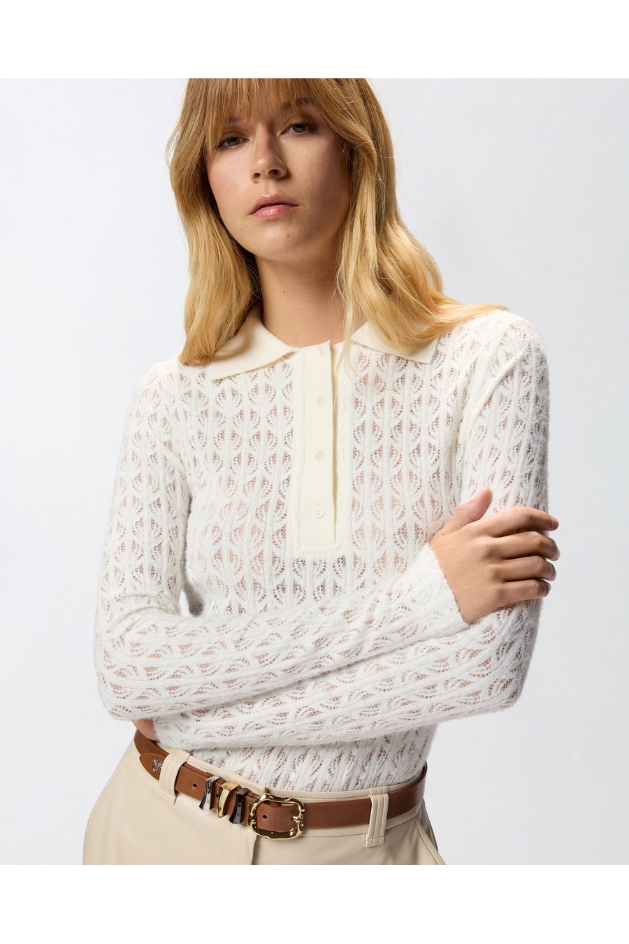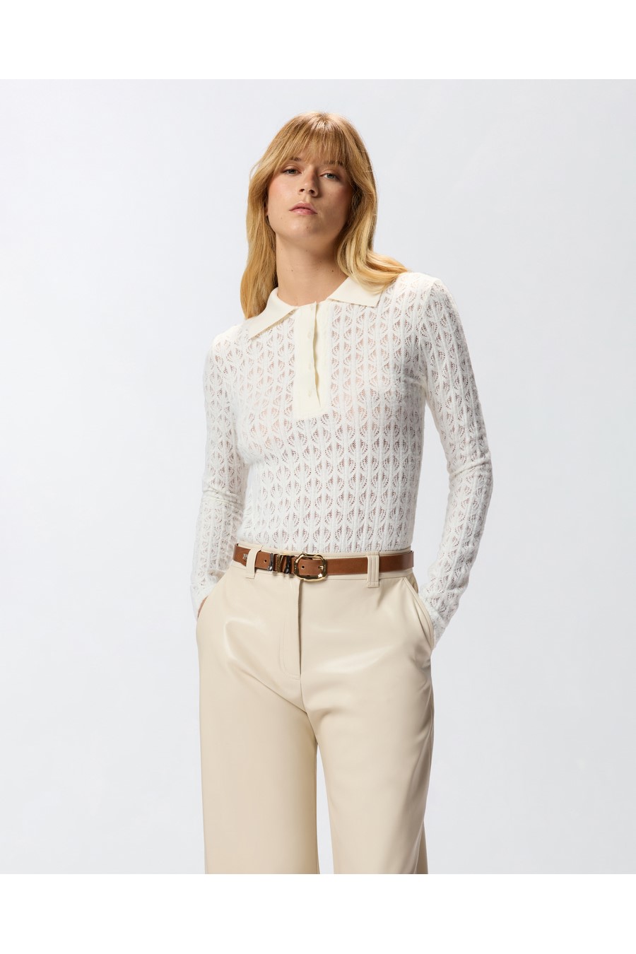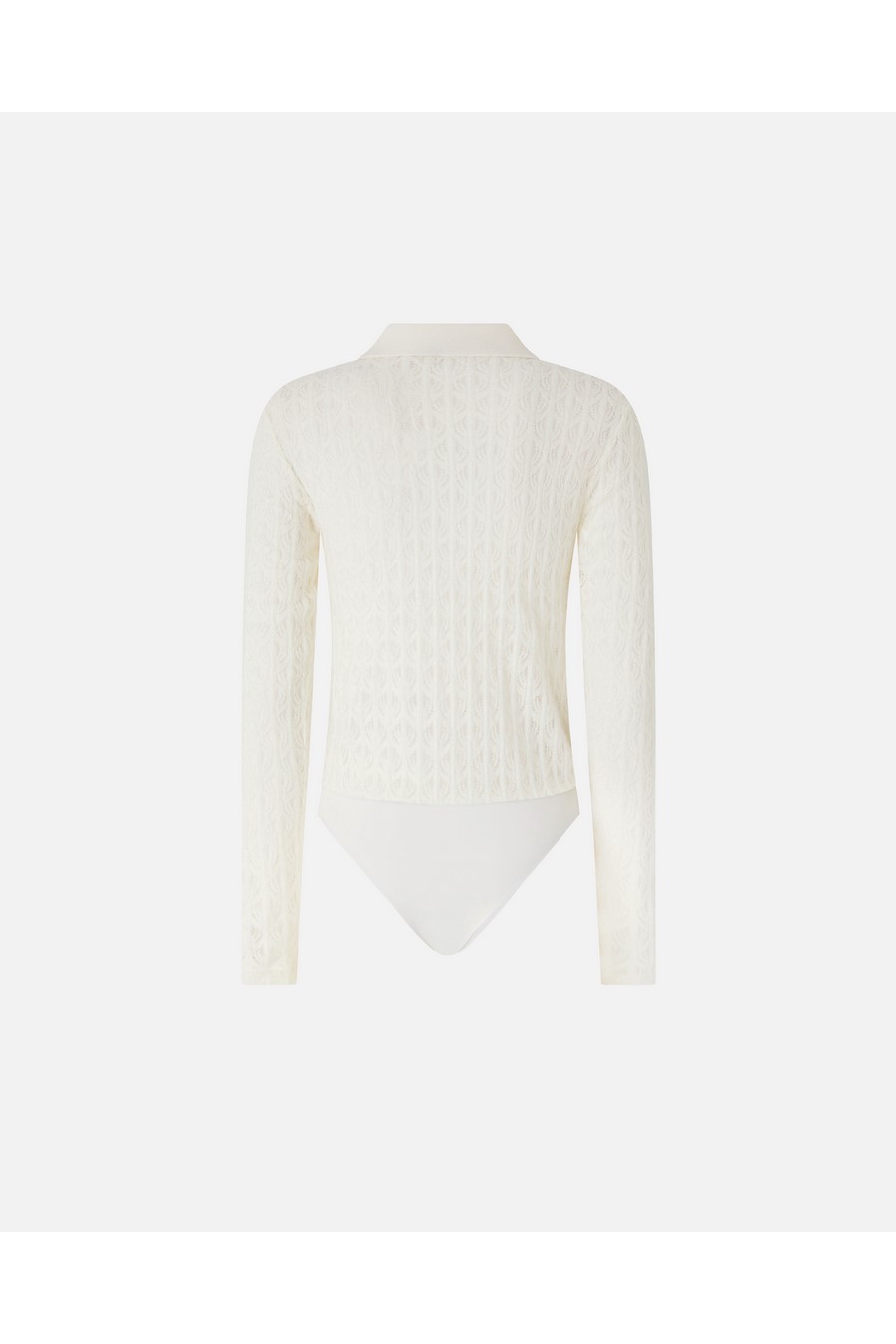 Pinko long-sleeved bodysuit made of warm and cosy lace. The top features a polo-style silhouette with a collar and button fastening, while the bottom is reminiscent of a classic bodysuit.