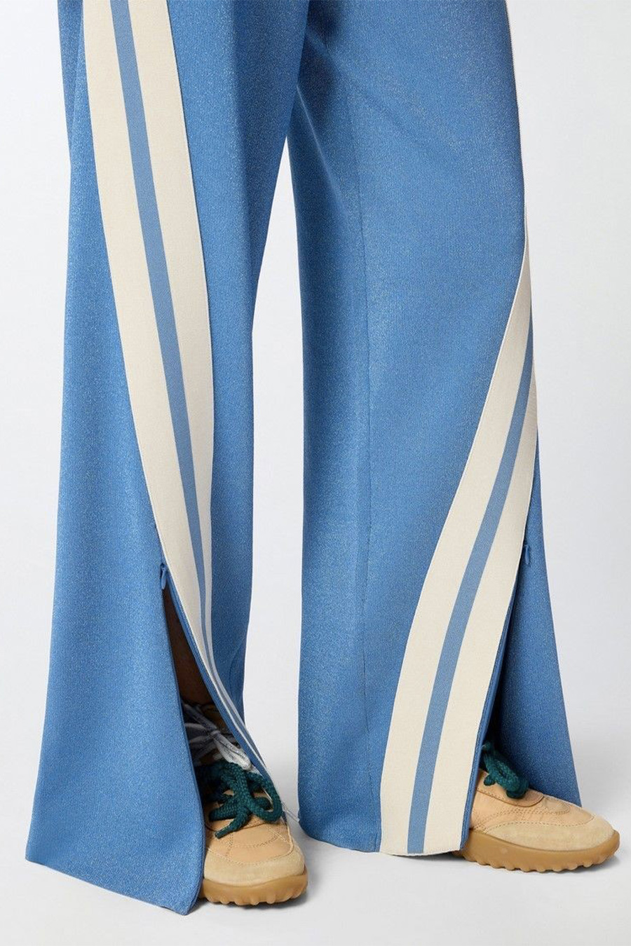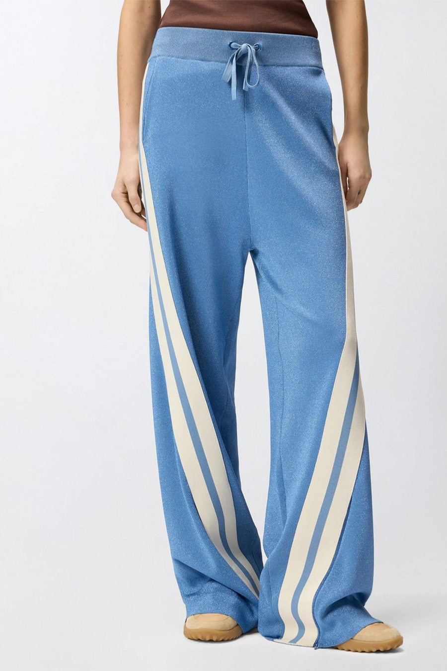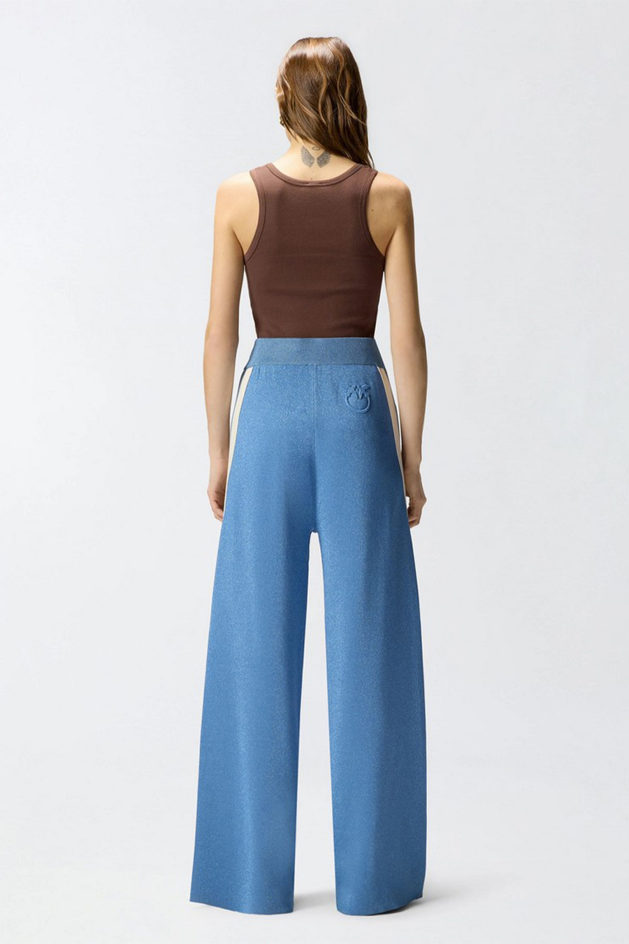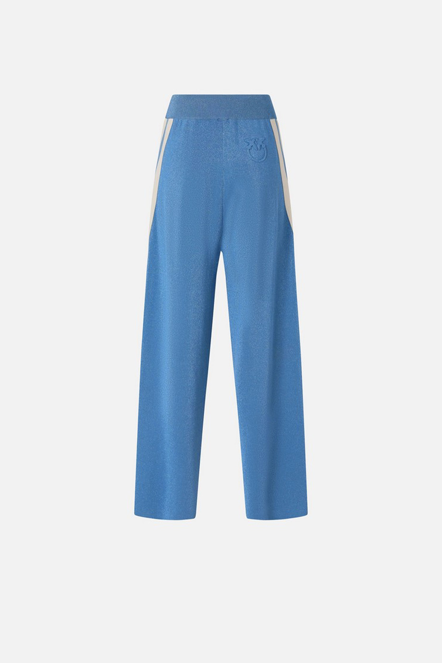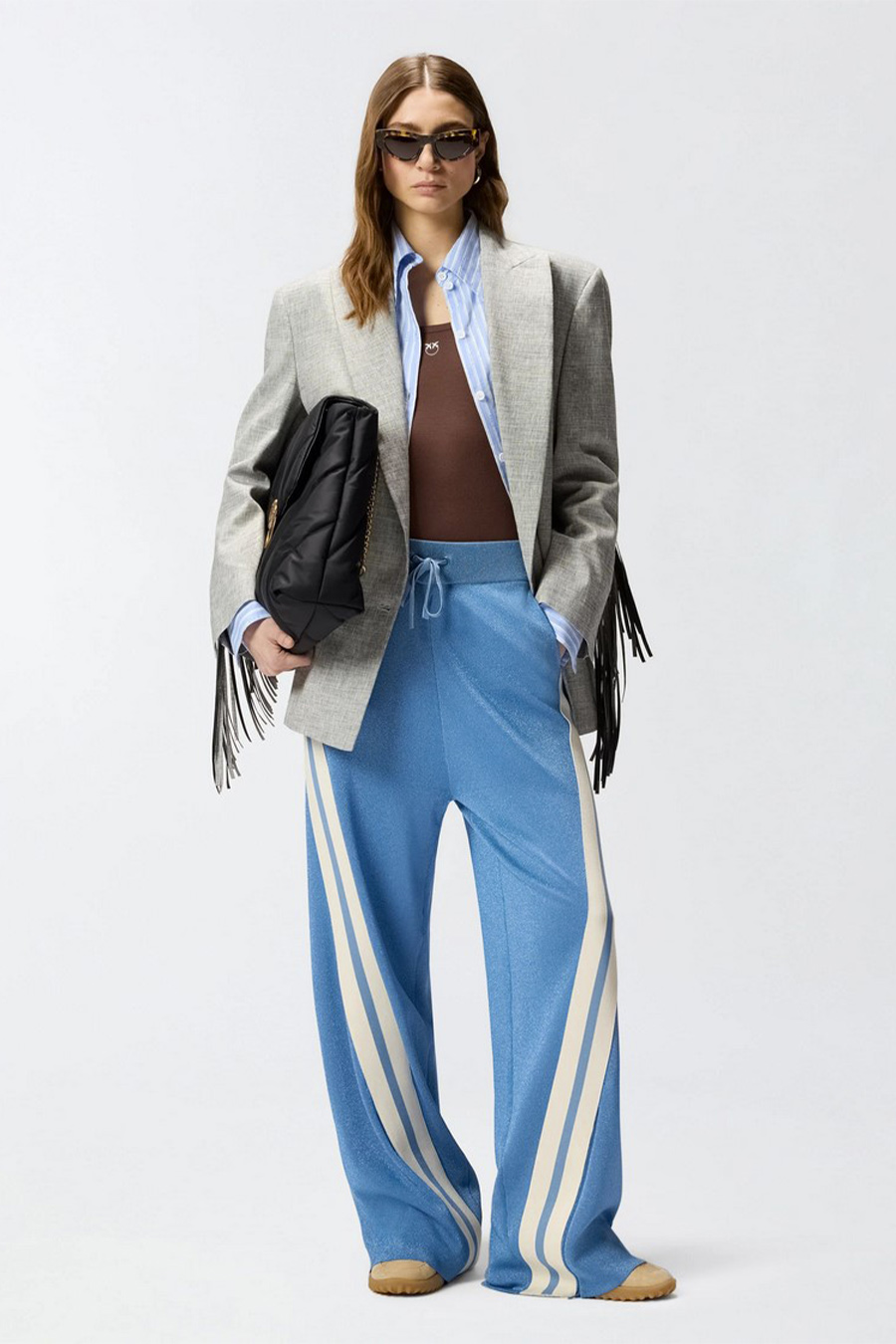 Pinko sports trousers with soft legs at the bottom, made of sweatshirt-effect piqué fabric with a thin metallic thread inside that adds shine, elasticated waist with drawstring, side pockets and zip at the bottom of the leg to customise the fit, featuring double contrasting side bands that add movement to the design.