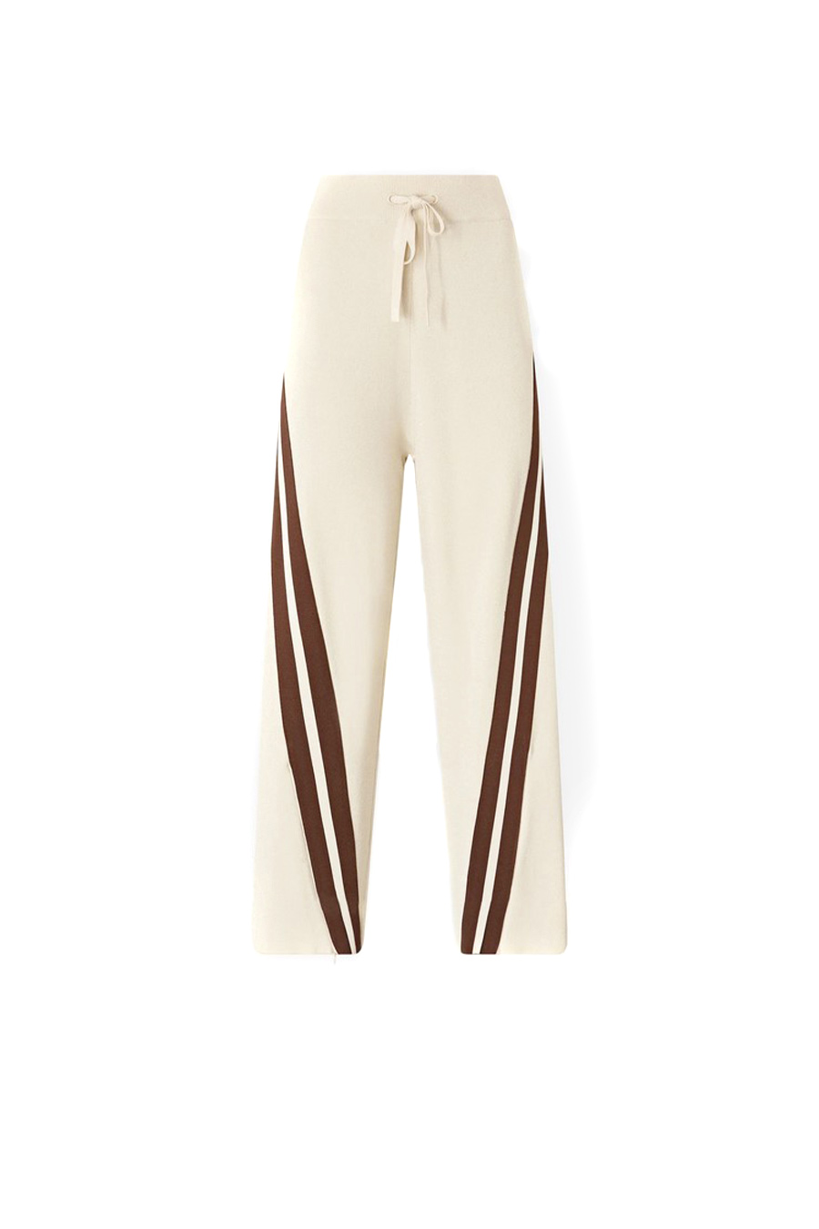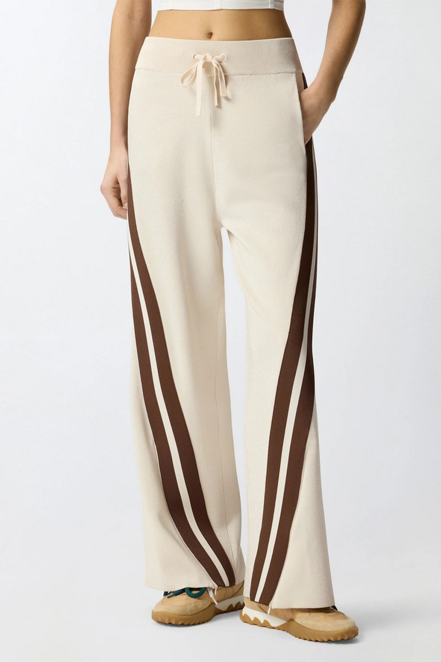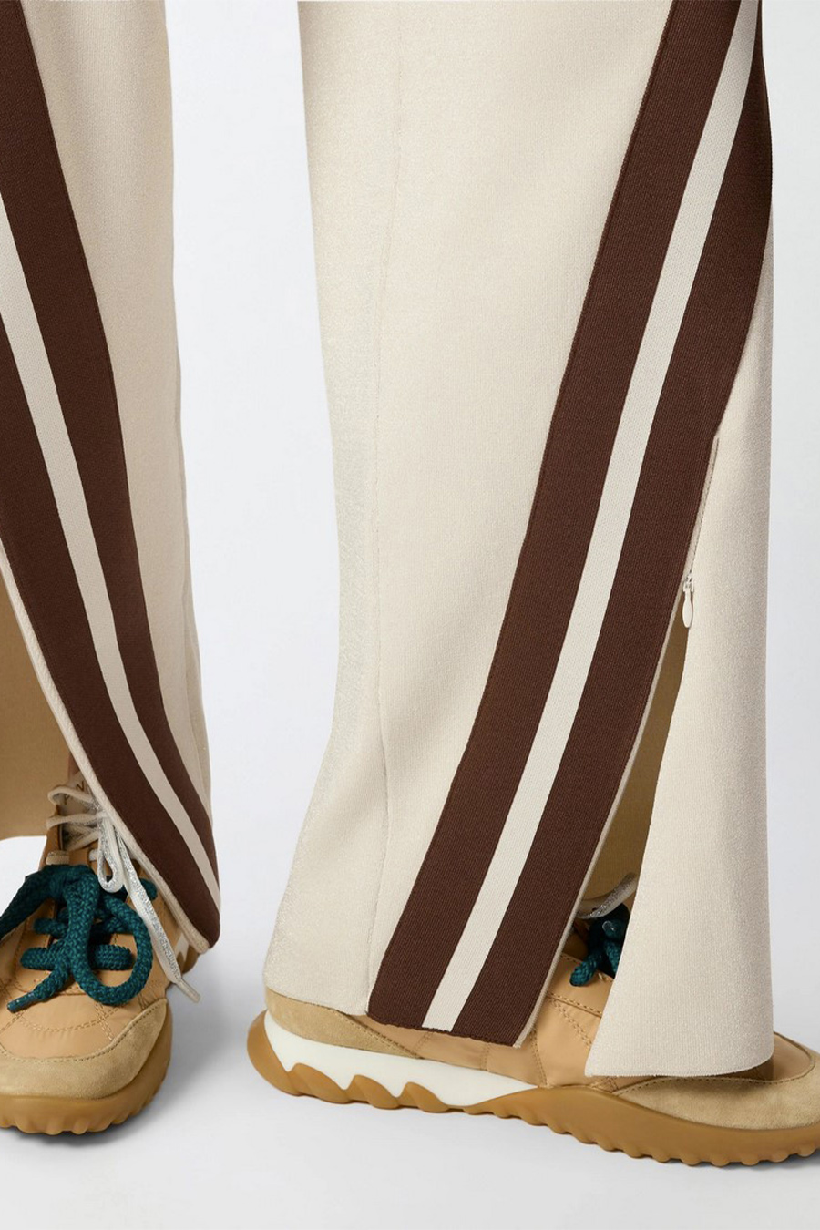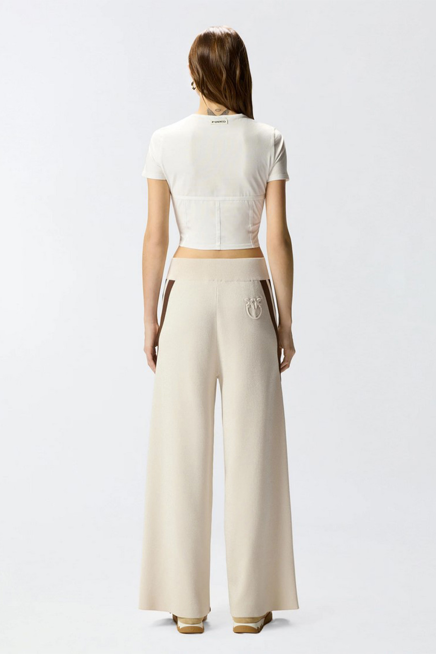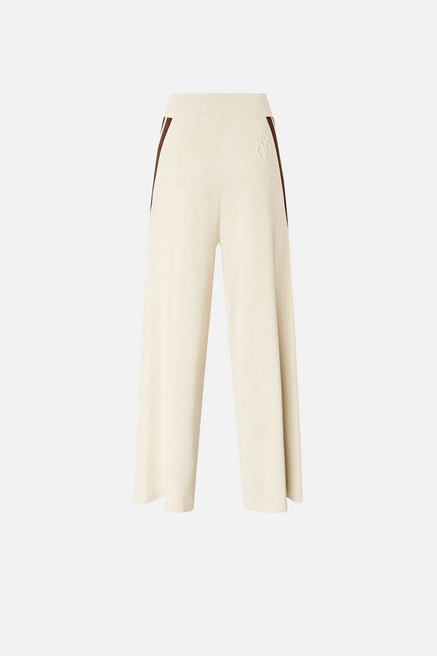 Pinko sports trousers with soft legs at the bottom, made of sweatshirt-effect piqué fabric with a thin metallic thread inside that adds shine, elasticated waist with drawstring, side pockets and zip at the bottom of the leg to customise the fit, featuring double contrasting side bands that add movement to the design.