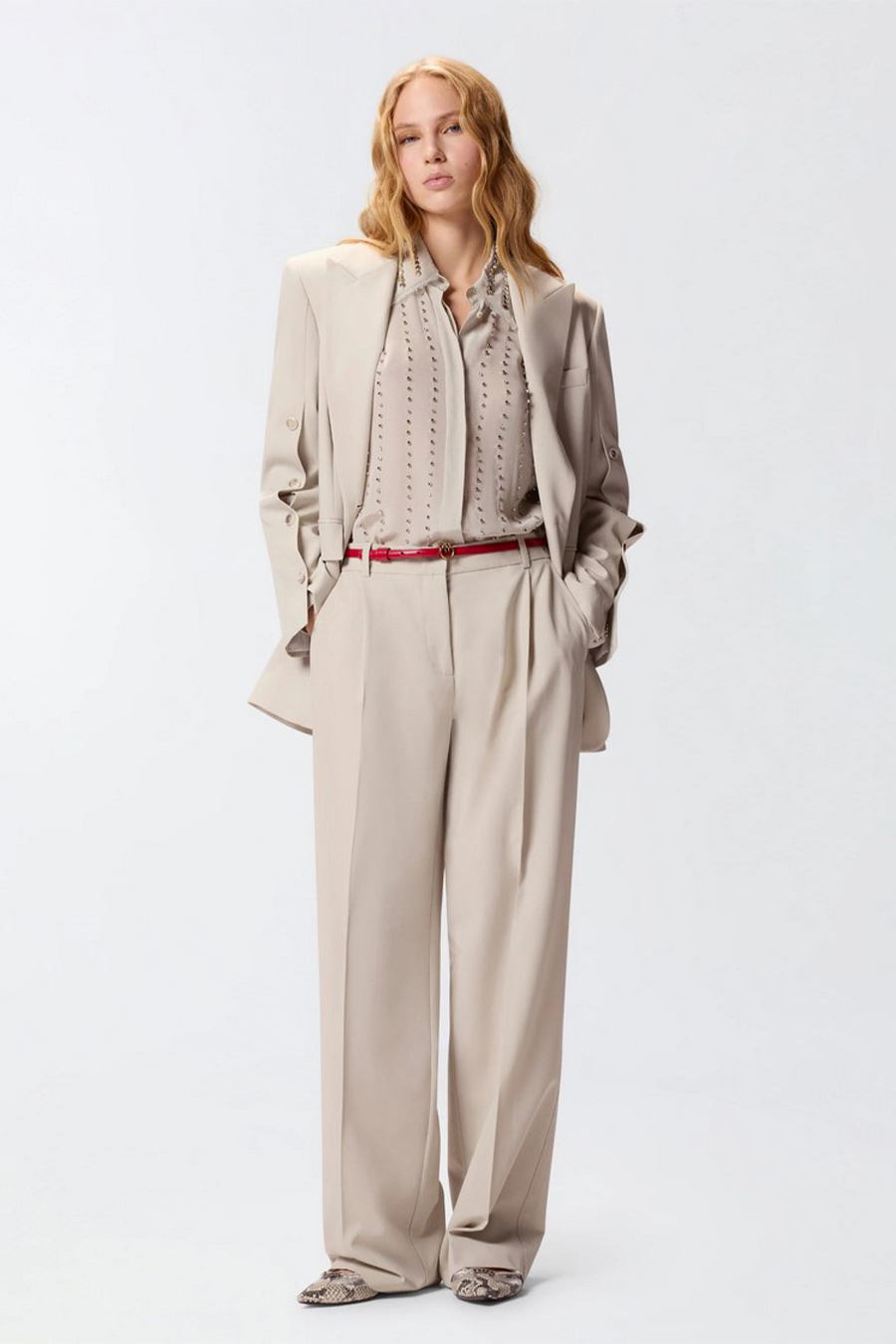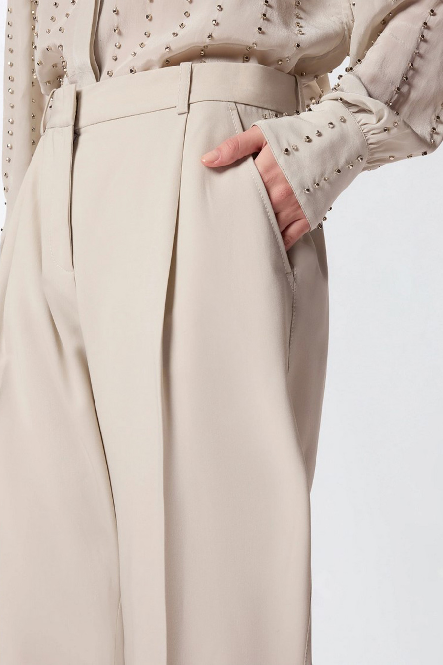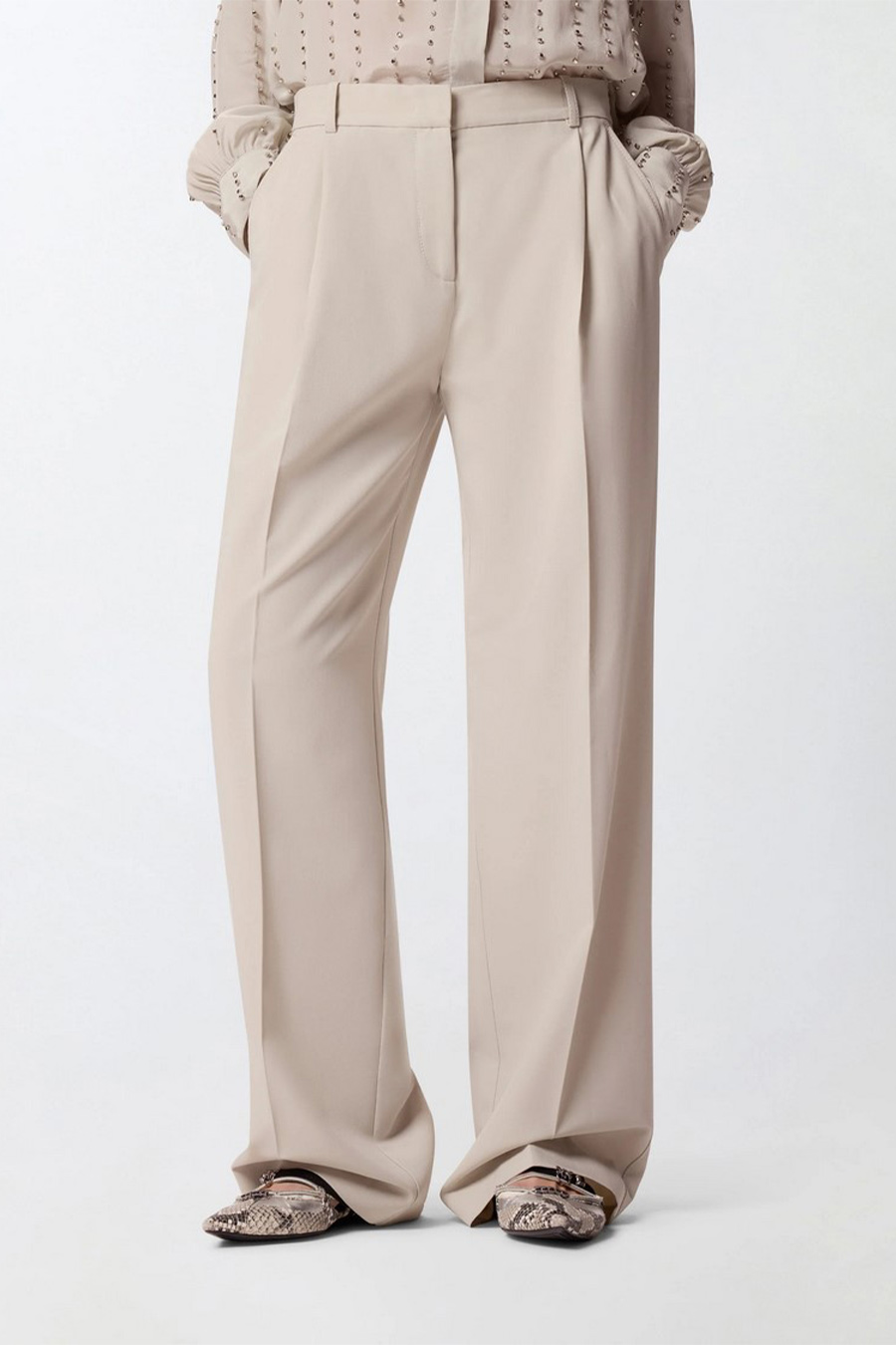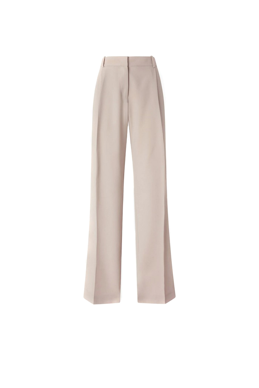 Pinko straight-leg trousers made from a stretch viscose blend fabric with a fluid drape. The garment stands out for its refined crease along the leg and two welt pockets at the back, and is completed by a concealed zip fastening and internal hook.