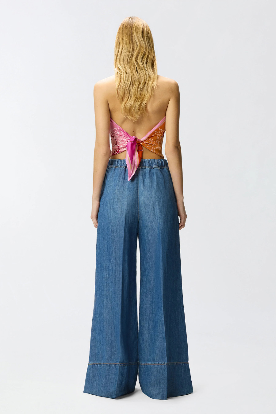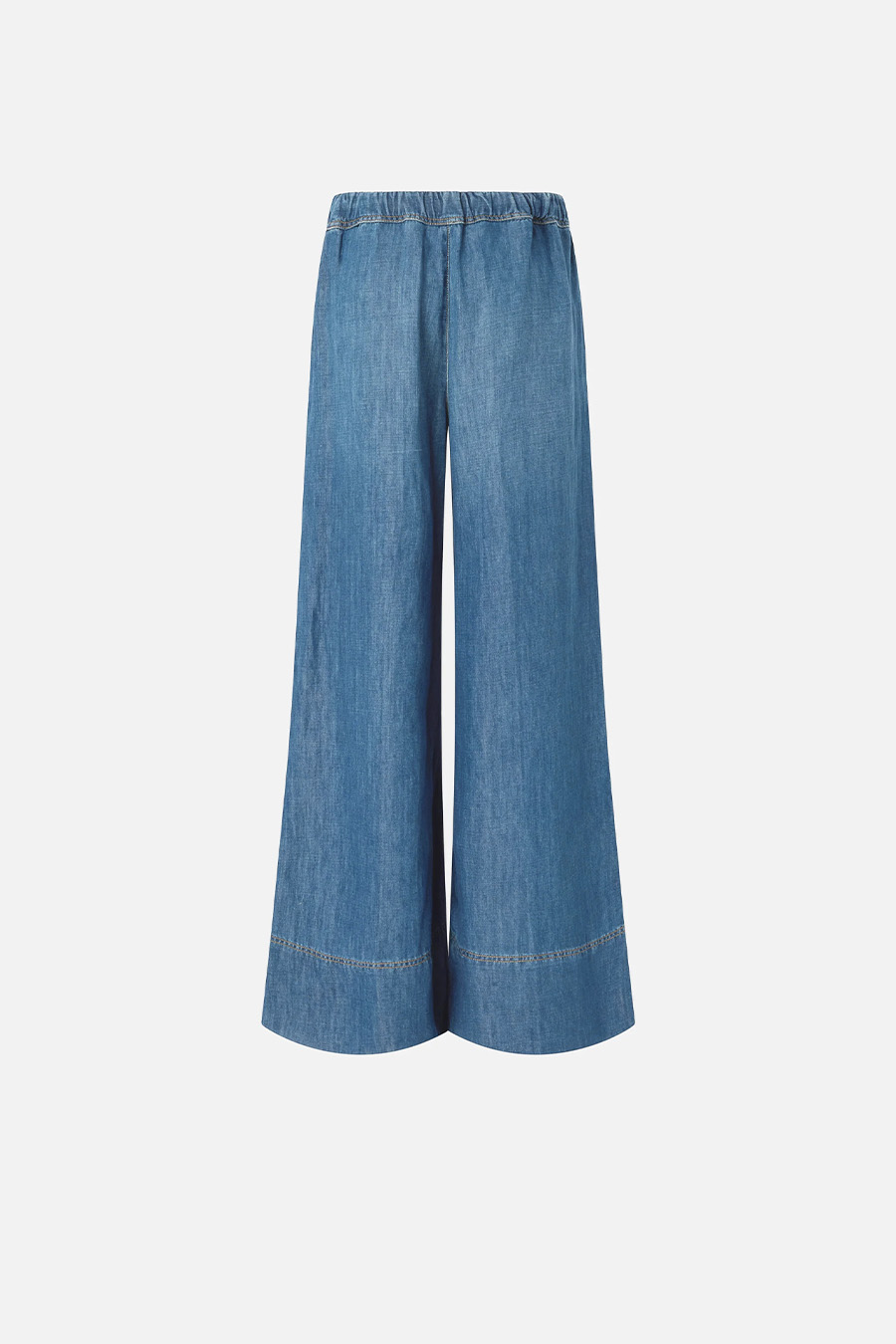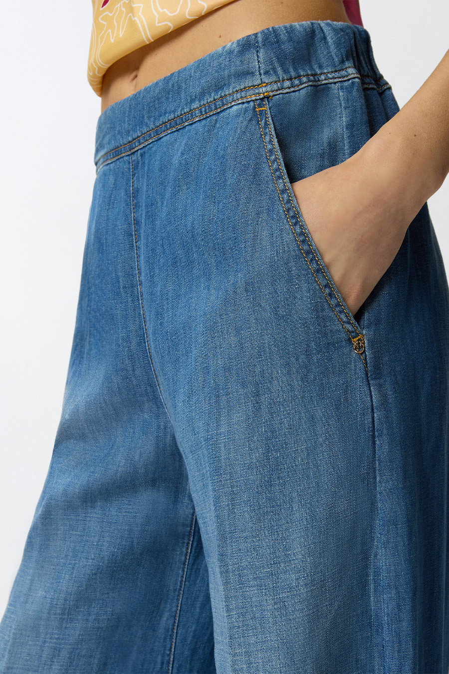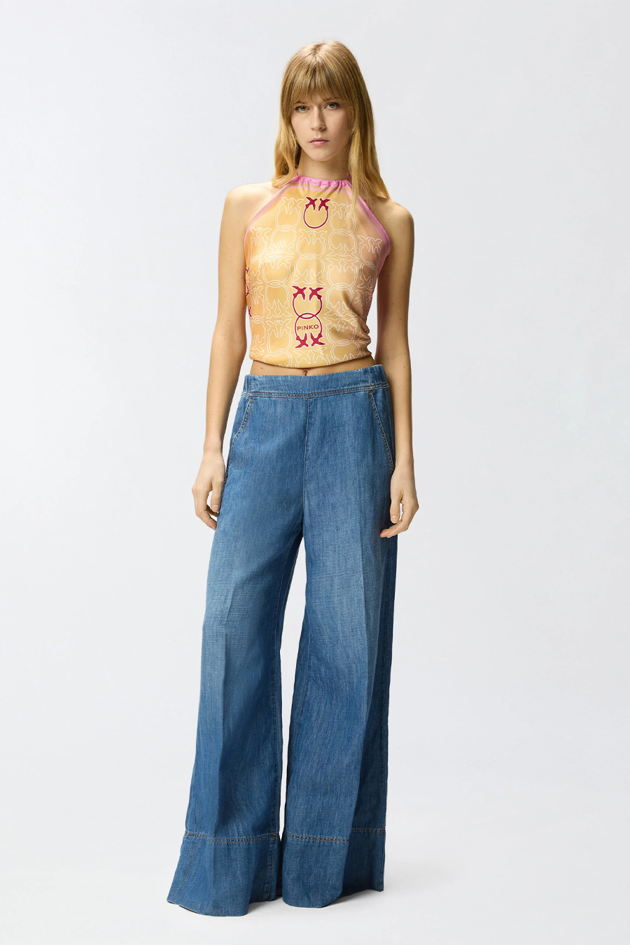 Pinko wide-leg denim trousers in a cotton and linen blend with a wide, slightly flared leg. Made from a lightweight, comfortable cotton and linen blend denim with a stone wash treatment that creates a vintage effect on the fabric, featuring an invisible side zip for easy wear.
