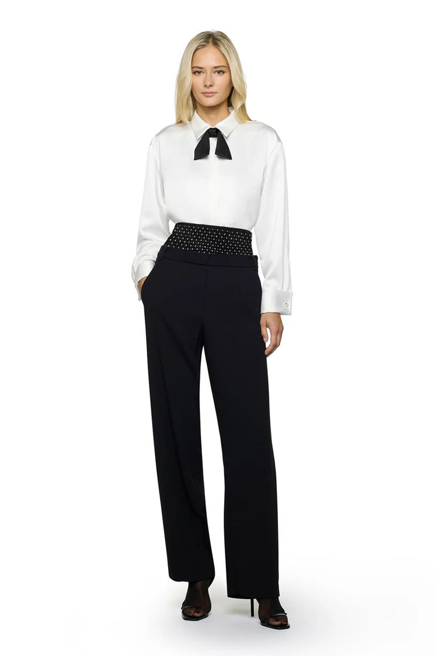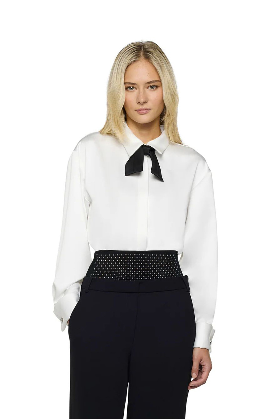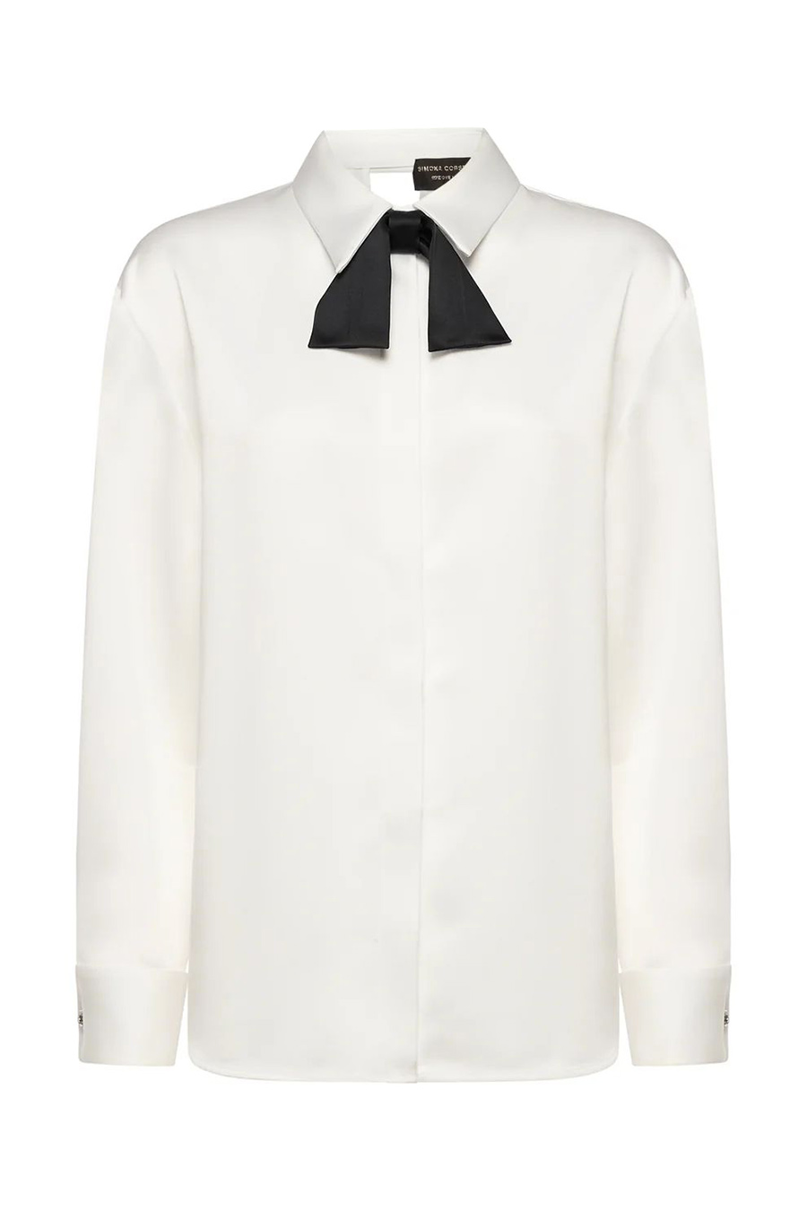 Simona Cotrsellini smocked shirt with untied heavy satin bow tie, deep opening at the back, pointed collar, bow tie with strap, concealed front button fastening and gold cufflinks, rounded hem.