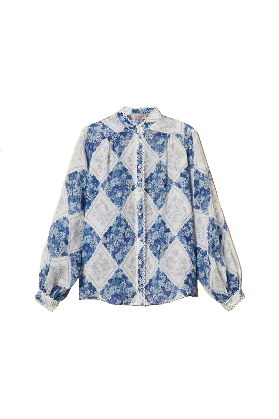 It features a mandarin collar, button fastening, long balloon sleeves, buttoned cuffs, trimmings with braiding, and a straight cut.