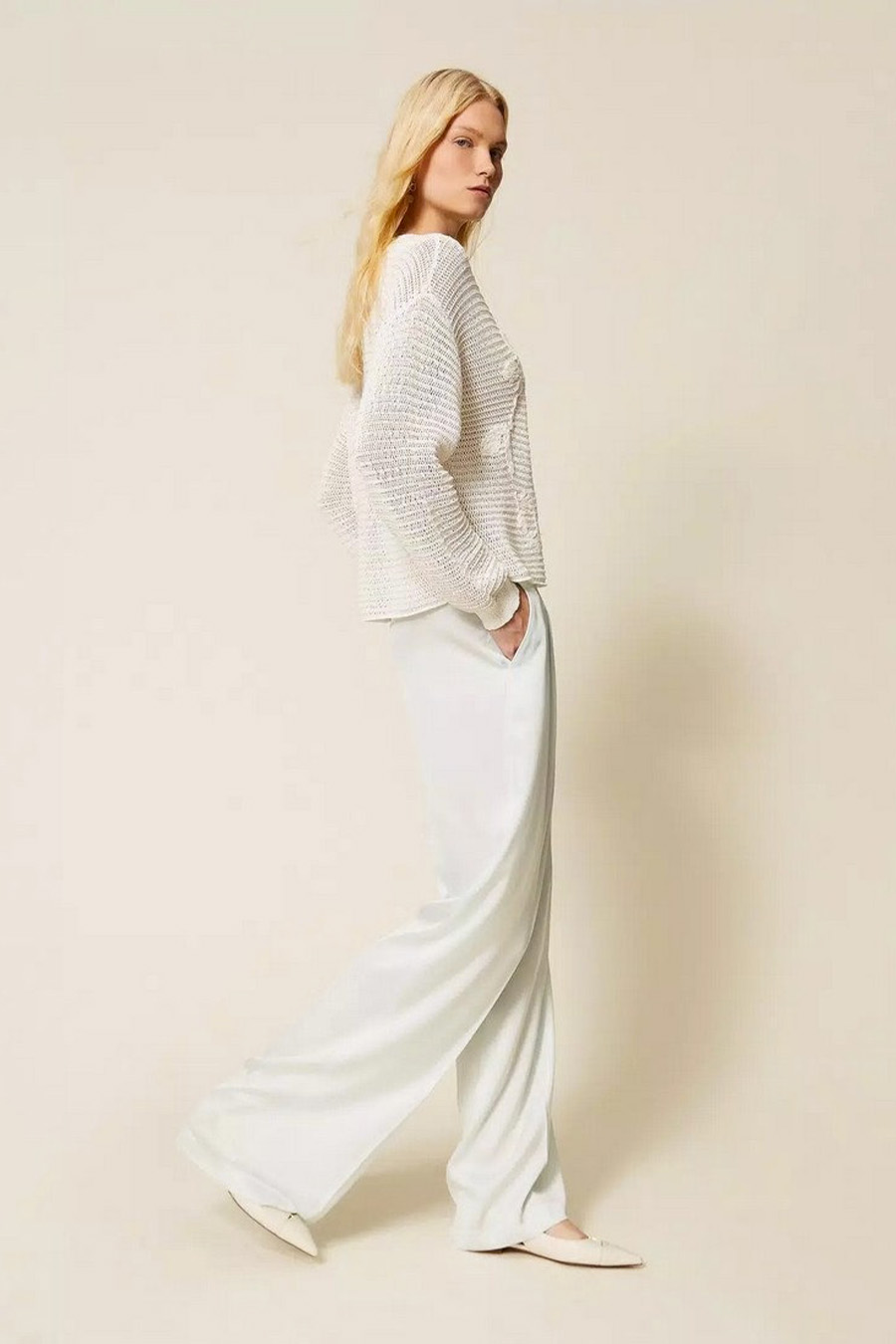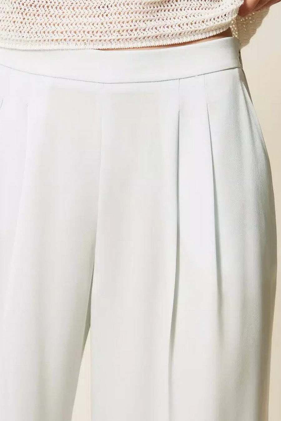 Wide-leg Twinset satin trousers with pleats at the front, a side zip fastening, an elasticated waistband at the back, French pockets and a loose fit.